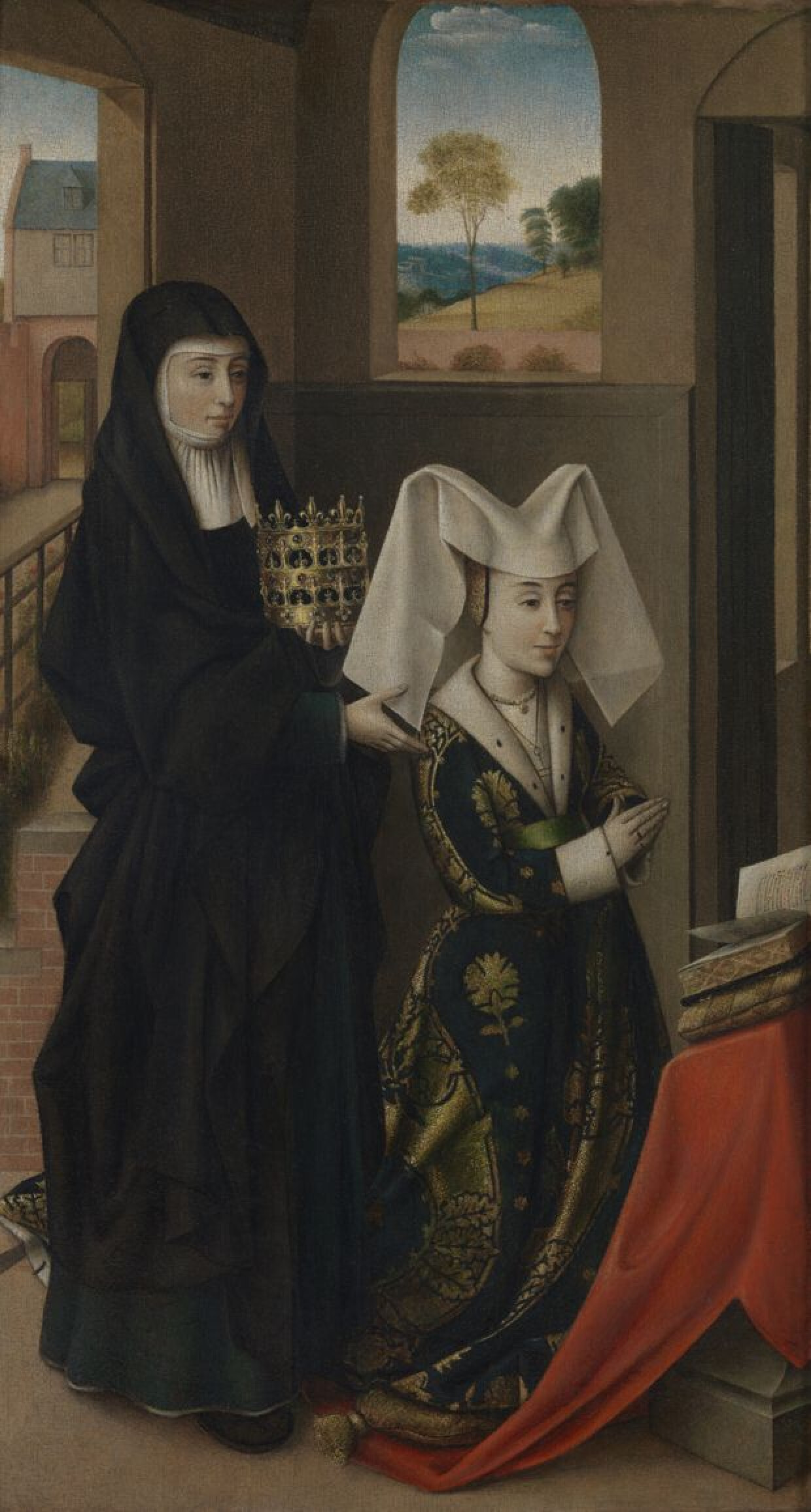 15de eeuwHet paneel met het portret van Isabella van Portugal vergezeld van haar patroonheilige Elisabeth van Hongarije is het linkerluik van een triptiek. Op de achterzijde zijn nog sporen van een grisaille aanwezig waarin de engel Gabriël van de Annunciatie herkend kan worden. Petrus Christus vervaardigde dit drieluik kort voor zijn dood in 1472 in opdracht van Isabella van Portugal. Het werk werd later door Catherine de Buisson, abdis van het Sint Elisabethklooster van Quesnoy aan Margareta van Oostenrijk geschonken. Het middenpaneel toonde een piëta en het rechterluik de heilige Catherina.