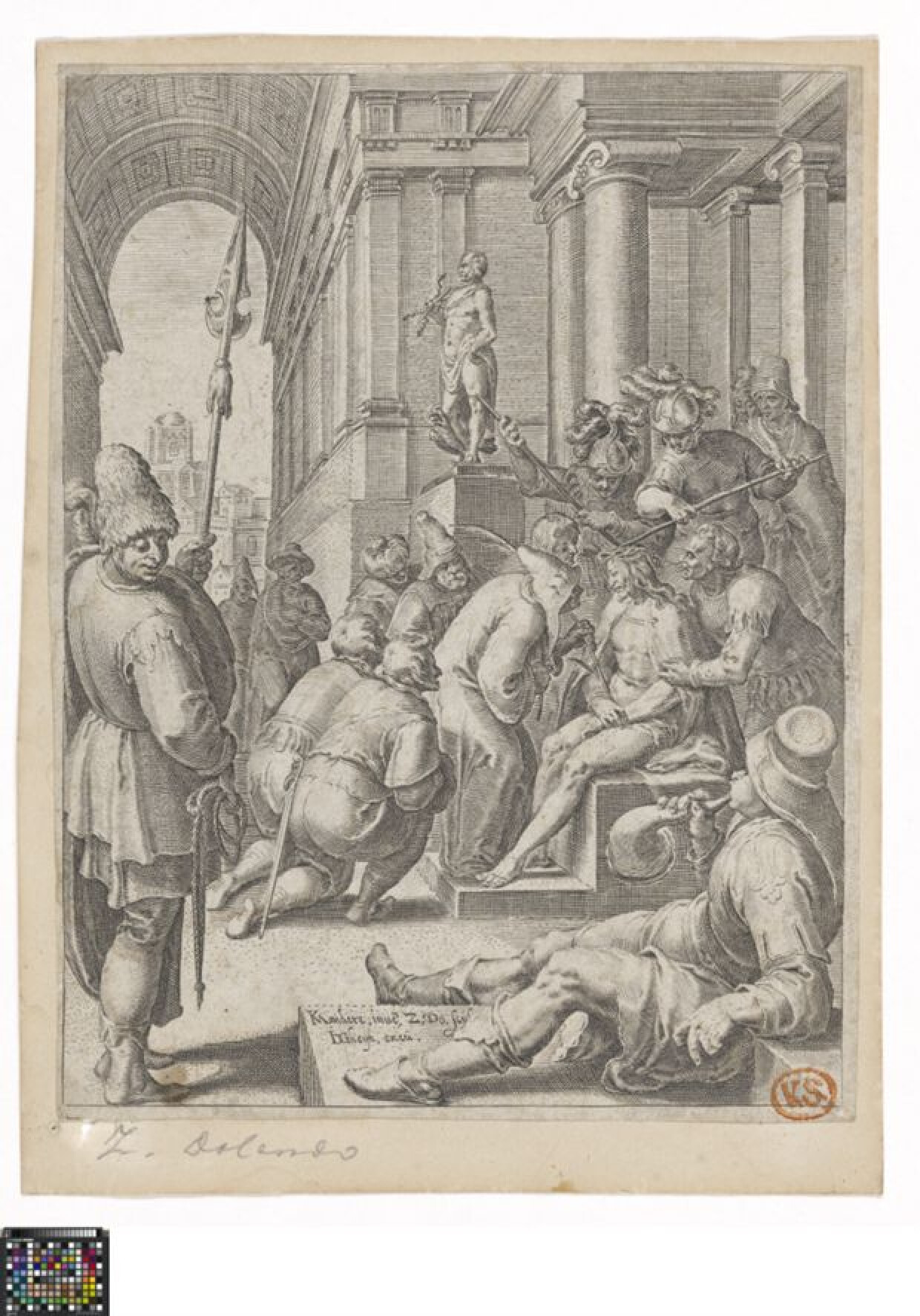 (1596 - 1598)Rechts in de voorstelling zit Christus op een troon in een tempel. Hij wordt bespot als koning van de Joden. Hij krijgt een mantel omgeslagen en hij wordt gekroond met een krans van doornen. Twee figuren knielen voor hem. De prent maakt deel uit van een passiereeks door Jacques de Gheyn II en Zacharias Dolendo (New Holl. The De Gheyn Family, part 1, 36-49, 43).