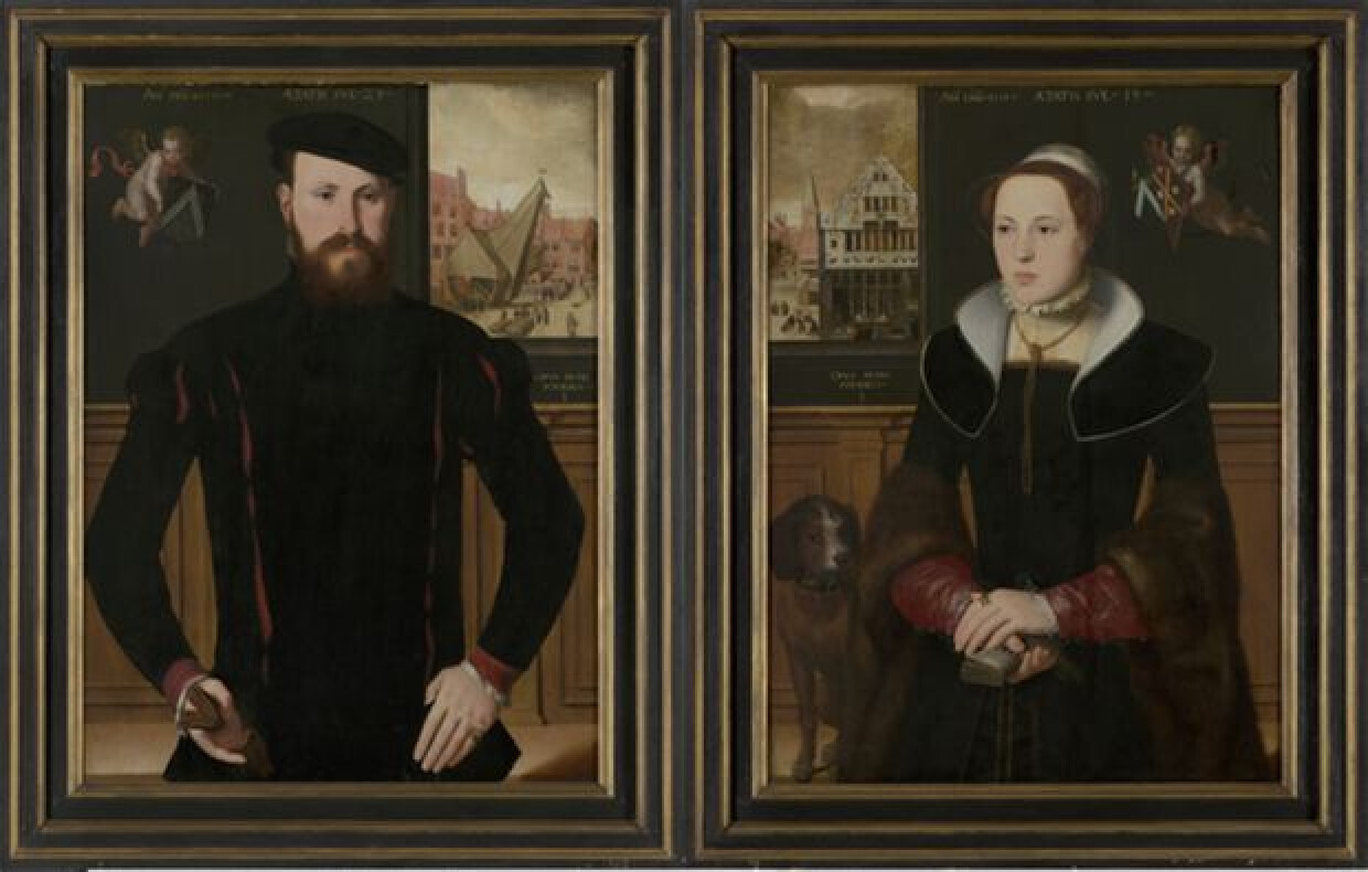 16de eeuwDeze twee portretten vormen een losse diptiek. Het echtpaar trouwde in 1551 of 1552 en liet zich ter gelegenheid van deze plechtigheid vereeuwigen in dit huwelijksportret. Jan van Eyewerve is strak frontaal en in een driekwart positie voorgesteld. Hij houdt de ellebogen uiteen. Dankzij zijn handschoen weet hij zijn rechterhand een elegante houding te geven. Aan de pink van zijn linkerhand bemerken we twee ringen. Zijn kledij is rijk maar sober. Uit het geheel kon opgemaakt worden dat hij behoort tot de welgestelde Brugse burgerij. De man bevindt zich in een vertrek op de verdieping van een huis in de Vlamingstraat te Brugge. De binnenruimte van de kamer wordt gesuggereerd door een achterwand met een smalle muurbank en een sobere renaissance lambrizering. Links boven draagt een putto zijn wapenschild. Het schilderij wordt links boven gedateerd en midden boven wordt de leeftijd van de man vermeld. Rechts boven biedt een raam uitzicht op de Kraanplaats en de Vlamingbrug. Links bevindt zich het Weeghuis en centraal op het plein staat de houten hijskraan "Craene" met bovenop de afbeelding van een kraanvogel. De stadswerklieden die het werktuig bedienen, rusten uit op de rand van het rad. Baliekluivers hangen over de kademuren en een sjouwer stoot zijn kruiwagen. Twee broeders van het Sint-Janshospitaal houden het toezicht bij het lossen van de wijn, waarvan zij een beker aangeboden krijgen; een bedelmonnik loopt voorbij. Alles gaat verder op het pendant waarop Jacquemyne Buuck is afgebeeld tot juist onder de heup en staat lichtjes naar haar echtgenoot toegekeerd. Deze afgewende houding accentueert de elegantie van de man. Ze houdt beide handen die formeel over elkaar zijn gevouwen ter hoogte van de schoot. Aan de wijsvinger van haar linkerhand prijken twee ringen. In de rechterhand houdt de vrouw haar handschoenen en een paternoster. Ze bevindt zich samen met haar echtgenoot Jan van Eyewerve in de zelfde ruimte op de verdieping van een woning in de Vlamingstraat te Brugge. De binnenruimte van de kamer wordt hier gesuggereerd door een achterwand met een smalle muurbank en een sobere renaissance lambrisering. De vrouw is net als haar echtgenoot donker gekleed. Ze draagt een hoog aansluitend, fijn geborduurd hemd met een gepijpt kraagje. Een stijve schouderkap, met wit damast gevoerd en afgezoomd met kant, hangt over haar schouders. De mouwen van het kleed zijn op driekwartlengte afgewerkt met bont, waaruit karmozijnen ondermouwen, met fijne kanten manchetten, te voorschijn komen. Op het hoofd draagt zij een ragfijne kanten muts die met een lint onder de kin is geknoopt. Rond de hals draagt zij een lange geknoopte ketting. Naast haar op de bank zit een hond als een levend symbool van de huwelijkstrouw. Het dier draagt een brede halsband versierd met een koperen ring, bel en een leeuwenkop. Rechts boven draagt een putto haar wapenschild. Het schilderij wordt gedateerd en ernaast wordt ook de leeftijd van de vrouw vermeld. Links onder het venster signeerde de kunstenaar met zijn naam en zijn huismerk. Links biedt het venster uitzicht op de Vlamingbrug en het huis De Haene. Het jaartal 1542, wapenschild en motto Plus Oultre van Karel V zijn leesbaar tussen de verschillende versierselen. Op de uitstalbank zien we vreemde koopwaar; helemaal vooraan koopt een broeder iets van een marktkramer. Naast het huis spelen kinderen met enorme dobbelstenen. Over de Kraanbrug zien we de toren van de St.-Janskerk en verder nog, aan de overzijde van het St.-Jansplein, het huis de Croone, eveneens getuige van de wijnhandel in Brugge.