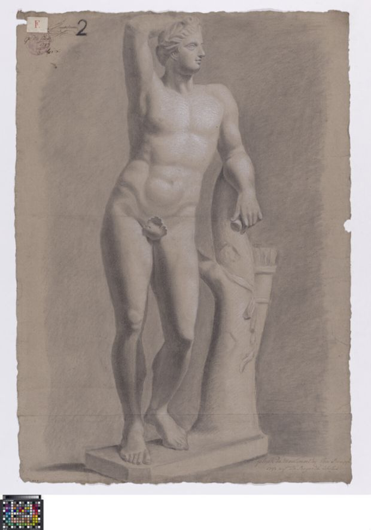 18de eeuwAcademische studie naar sculptuur van Apollo Medici, getekend door Jozef De Meulemeester in 1793. De Meulemeester kwam uit de Bogardenschool en was een leerling aan de Academie Brugge, ingeschreven in de klas naar 'bosse' waarin naar afgietsels werd getekend. Met deze studie behaalde hij de tweede prijs. In dezelfde wedstrijd werd Gregorius primus (0014.GRO0043.II). Net als Gregorius tekende hij toen twee studies (zie ook 0014.GRO0033.II). Voor deze studie werd naar een afgietsel van het beeldhouwwerk Apollo Medici getekend. Apollo is getekend vanuit driekwart aanzicht. Hij staat in contrapost, houdt zijn rechterarm op zijn hoofd en zijn linkerarm op een boomstronk. Aan de stam hangt zijn pijlenkoker. Er is een aangelijmde strook onderin met verderzetting van de compositie (voeten en sokkel) en opschrift. Het gebruikte medium is zwart krijt of houtskool, met hoogsels in wit krijt. Het etiket met de letter 'F' is linksboven op het papier verlijmd. Dit is de tekenletter die werd toegewezen aan De Meulemeester tijdens de wedstrijd voor anonieme jurering. Daarnaast staan de handtekeningen van directeur Paul de Cock, secretaris Frans Vande Steene en leraar Bernard Fricx, bij de academiestempel.
