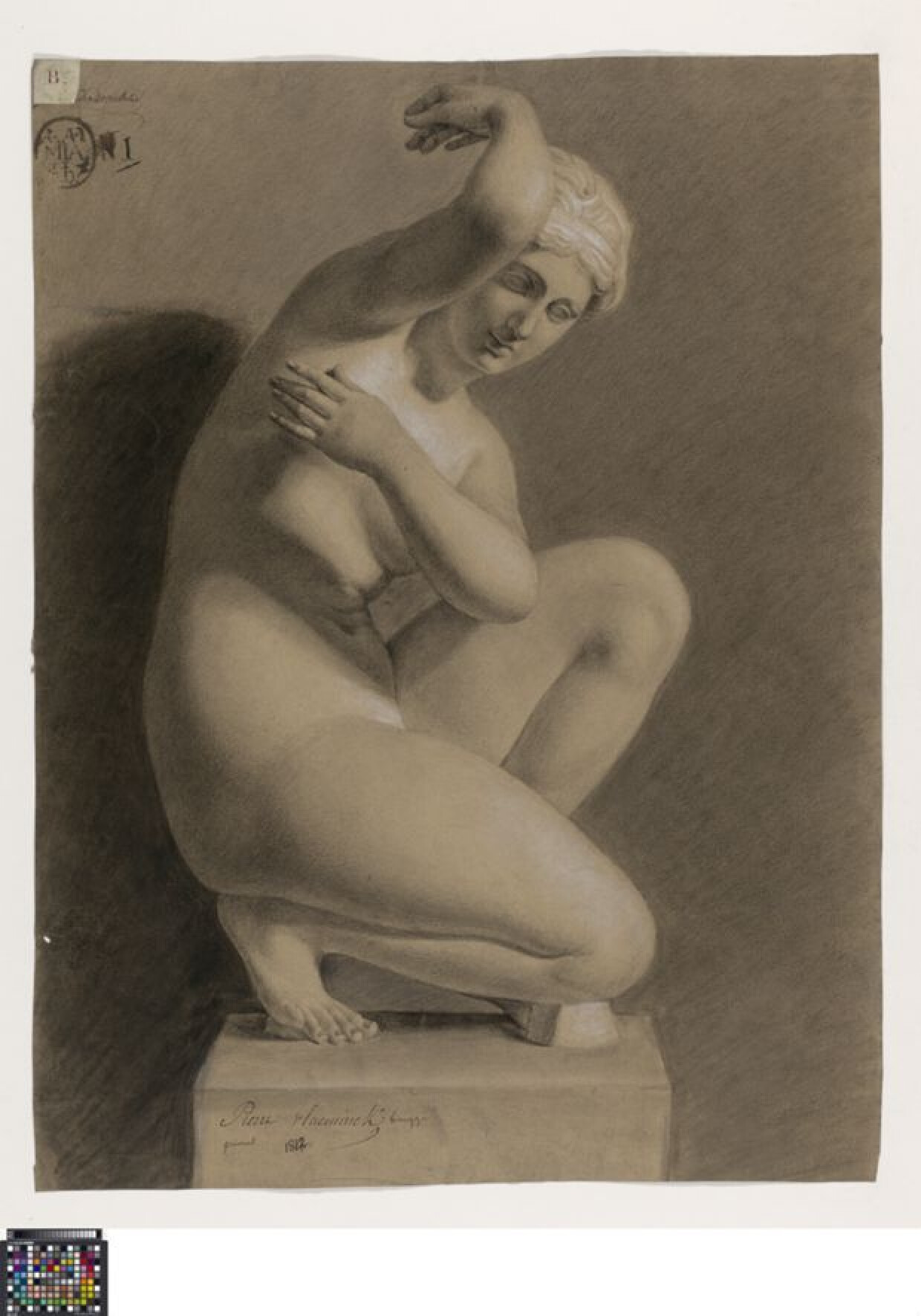 19de eeuwAcademische studie naar sculptuur van Venus, getekend door Pieter-Jan de Vlamynck in 1812. De Vlamyck was toen leerling in de klas naar plaaster aan de Academie Brugge. Voor de prijskamp maakte hij twee tekeningen (zie ook 0016.GRO0109.II) waarmee hij de eerste prijs van zijn klas gehaalde. Jacques Goddyn werd tweede (0016.GRO0156.II). Een standbeeld van Venus is voluit en in profiel naar rechts afgebeeld. Venus is naakt en zit hurkend met haar rechterknie naar de grond toe. Haar gezicht is in driekwart weergegeven. Ze houdt haar rechterarm omhoog, geplooid met de hand naar haar rug toe. Haar linkerarm houdt ze gekruist voor de borst, reikend met de hand naar haar rug. De Vlamynck tekende wellicht naar een afgietsel van het standbeeld van de hurkende Venus dat vandaag tot de collectie van het Louvre behoort. Het gebruikte medium is zwart krijt of houtskool, gehoogd met wit krijt. Vermoedelijk werden de bladranden rondom afgesneden. De aantekeningen duiden op de wedstrijddeelname van de Vlamynck. Op het etiket linksboven staat de tekenletter 'B.', aan hem toegewezen voor deze wedstrijd. Ook de academiestempel en handtekening van directeur van der Donckt zijn in die hoek te zien. Dat de Vlamyck eerste werd in de prijswedstrijd, werd met een 'J' (1) genoteerd. Nadien werden zijn naam en afkomst, het jaartal en zijn wedstrijdtitel(cf. primus) onderaan opgeschreven.