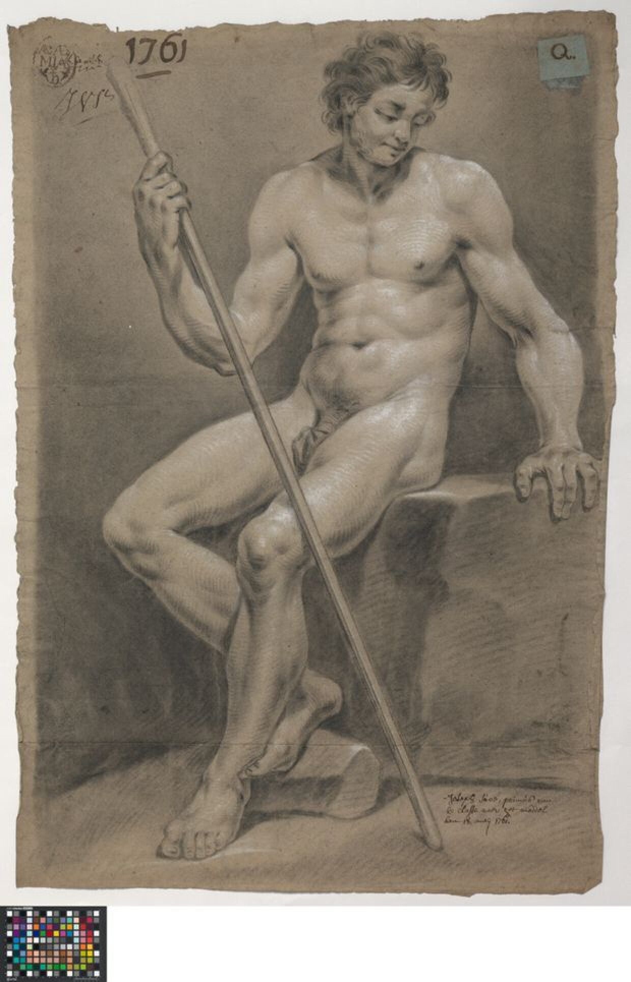 18de eeuwAcademische studie naar levend model van een zittend mannelijk naakt, getekend door Joseph Suvée in 1761. Suvée tekende deze studie tijdens de prijswedstrijd aan de Academie Brugge en won er de eerste prijs mee in de klas naar het levend model. Het zittende naaktmodel werd door Suvée in driekwart naar links afgebeeld. De man houdt een stok diagonaal voor zijn lichaam. Hij steunt met zijn andere hand op de zitblok en kijkt naar rechtsonder. Het gebruikte medium is zwart krijt of houtskool, gehoogd met wit krijt. Onderaan is een brede strook aan het tekenpapier gelijmd, waarop de compositie vervolledigd werd. Op de achterzijde is er op deze papierstrook getekend. Het gaat wellicht om recuperatie van tekenpapier. De studie draagt aantekeningen in verband met de wedstrijddeelname. Linksboven is de academiestempel op het papier gedrukt, met daarboven de handtekening van Matthias de Visch, directeur van de academie. Rechtsboven is een blauw papieren etiket op de tekening verlijmd waarop de letter Q geschreven is; dit is de tekenletter die Suvée toegewezen kreeg voor de anonieme beoordeling door de jury. Het cijfer 1 rechtsonder verwijst naar de behaalde eerste prijs. De annotatie op de aangelijmde strook benoemt de vervaardiger en zijn gewonnen prijs: 'Joseph Suvée, primus van de classe naer het moddel den 18. meij 1761'. Uit een archiefdocument weten we dat Suvée als eerste prijs een zilveren medaille met een agrafe of siergesp won bij de prijsuitreiking in mei 1761 (SAB, Academie, nr. 43).