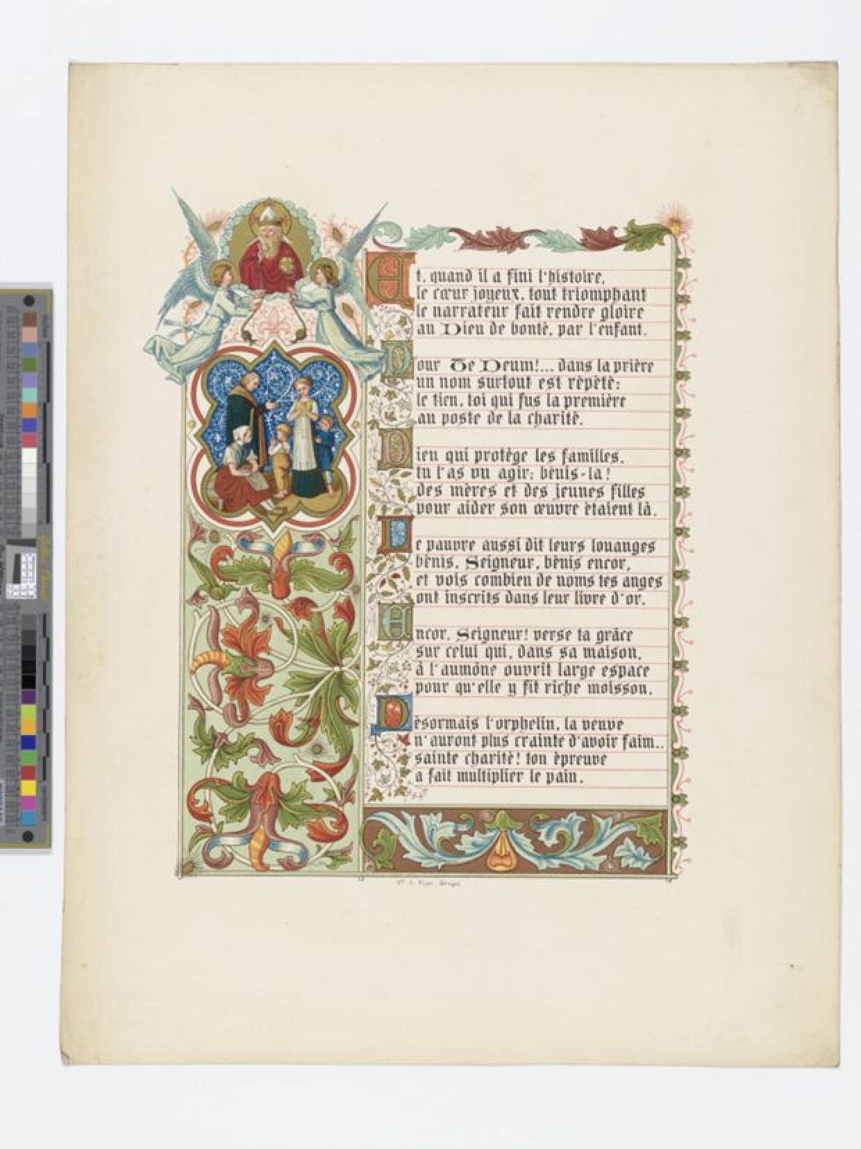19de eeuwEen chroomlithografie in neogotische stijl met geschreven sonnetten over liefdadigheid door Auguste Lepas. De sonnetten zijn in grote Gotische letters gedrukt. De marge is versierd met bloemen en beeldt God af, omringd door twee engelen, alsook een gezin die samen bidden. De litho maakt als eerste plaat deel uit van een door Jules Heilbig gemaakte reeks lithografieën ter herinnering van de bazaar in Luik in 1875. Deze originele serie van 7 platen werd op 155 exemplaren gedrukt door de Brugse uitgeverij Jacques Petyt. Schilder en kunsthistoricus Jules Heilbig wordt samen met Jacques Petyt beschouwd als de absolute koplopers van de Belgische neogotiek. Ze werkten dan ook vaak samen.