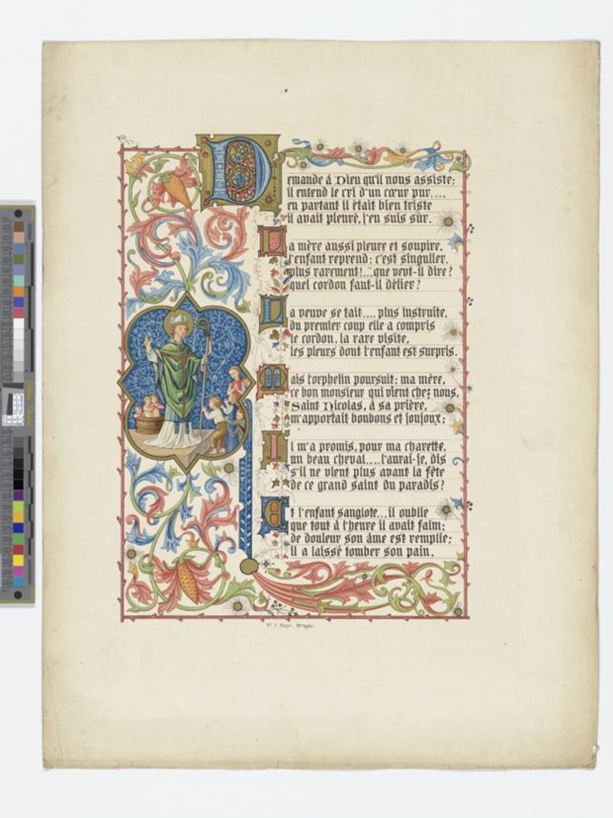 Een chroomlithografie in neogotische stijl met geschreven sonnetten over liefdadigheid door Auguste Lepas. De sonnetten zijn in grote Gotische letters gedrukt. De marge is versierd met bloemen en Sint-Niklaas met een achttal adorerende kinderen worden afgebeeld. Twee engelen dragen een leuze over barmhartigheid. De litho maakt als eerste plaat deel uit van een door Jules Heilbig gemaakte reeks lithografieën ter herinnering van de bazaar in Luik in 1875. Deze originele serie van 7 platen werd op 155 exemplaren gedrukt door de Brugse uitgeverij Jacques Petyt. Schilder en kunsthistoricus Jules Heilbig wordt samen met Jacques Petyt beschouwd als de absolute koplopers van de Belgische neogotiek. Ze werkten dan ook vaak samen.
