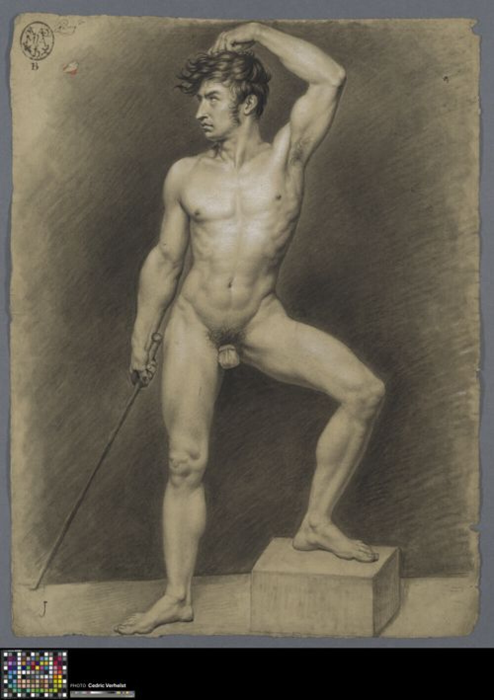 19de eeuwAcademische studie naar levend model van een staande naakte man, getekend door François Deweert. Hij werd tweede in de ranking van een wedstrijd aan de Academie Brugge tussen 1816 en 1818 (SAB, Academie, nr. 45). Het naaktmodel staat met zijn linkervoet op een voetblok, buigt zijn linkerarm omhoog en laat zijn hand rusten op zijn kruin. In zijn andere hand houdt hij het handvat van een stok vast. Het gezicht van de man is in profiel getekend. Het gebruikte medium is zwart krijt of houtskool, gehoogd met wit krijt. Directeur Ducq ondertekende de wedstrijdstudie linksboven. Hier staat ook de academiestempel met de tekenletter van de leerling voor anonieme jurering.