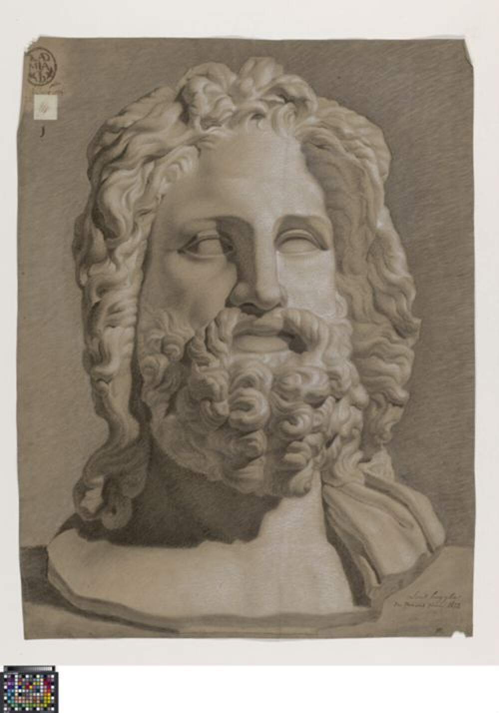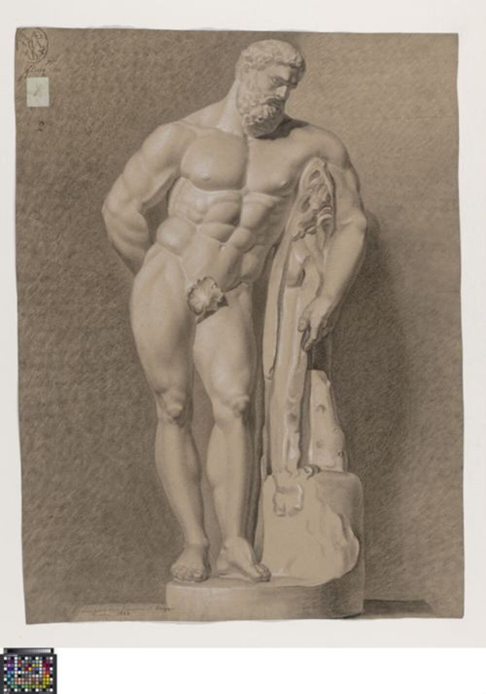 19de eeuwAcademische studie naar sculptuur van Hercules, getekend door Louis Huyghe in 1822. Huyghe was afkomstig van Torhout en leerling in de klas naar plaaster aan de Academie Brugge. Voor de wedstrijd om prijs maakte hij twee studies (zie ook 0016.GRO0175.II) waarmee hij primus van zijn klas werd. Leopold van Turnhout werd secondus (0016.GRO0174.II). Een standbeeld van Hercules is voluit en frontaal afgebeeld. Huyghe tekende deze studie naar een afgietsel van de 'Hercules Farnese', wellicht een Romeinse kopie naar een Grieks origineel van Lysippos. De naakte en gespierde Hercules staat in contrapost, kijkt naar linksonder en leunt met zijn linkerarm op zijn knots waarover de huid van de leeuw van Nemea gedrapeerd is. Hij heeft kort krullend haar en draagt een volle baard. Hij houdt zijn rechterhand achter zijn rug en verbergt zo de gouden appels van de Hesperiden. Het gebruikte medium is zwart krijt of houtskool, gehoogd met wit krijt. De bladranden zijn rondom bijgesneden. De aantekeningen duiden op Huyghes wedstrijddeelname. Op het etiket staat zijn toegewezen tekennummer '4'. Daarboven is de academiestempel met handtekening van directeur Ducq zijn te zien. Dat Huyghe eerste werd, noteerde men met een 'j' (of 1). Nadien werden zijn naam en afkomst, behaalde wedstrijdtitel en het wedstrijdjaar linksonder opgeschreven.
