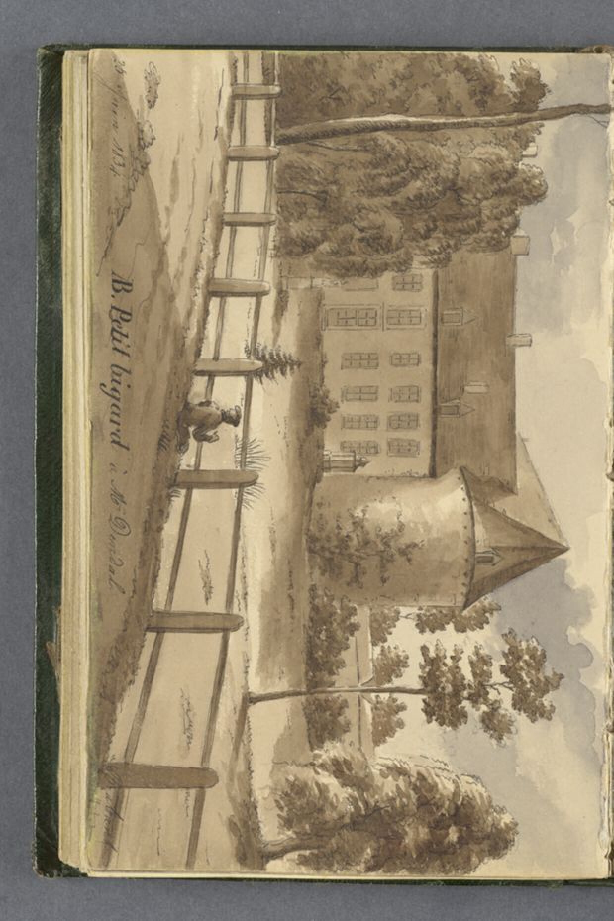 19de eeuwDe voorstelling toont een zicht op het kasteel van Klein-Bijgaarden, langs de priorij, voor de renovatie of aanpassing van Henri Beyaert. Op het moment van De Peellaert zijn bezoek woonde François-Joseph Dindal er samen met Pétronille Van Cutsem, de weduwe van François Wittouck die in 1814 werd vermoord.