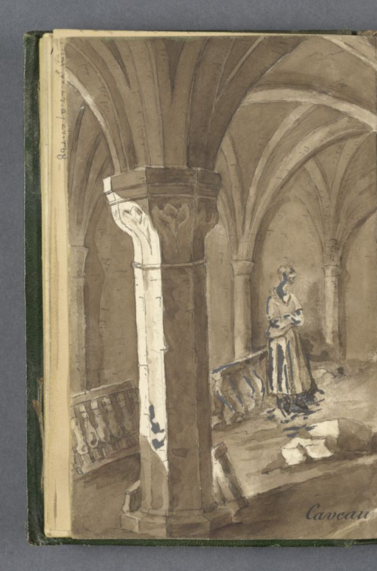 19de eeuwDe tekening in aquarel en sepia toont een zicht een grafkelder of crypte te Thorn. Een ribbengewelf rust op verschillende pilaren in de ruimte. Een vrouwelijke figuur is centraal afgebeeld. Achteraan staat een trapje en een deur naar boven.