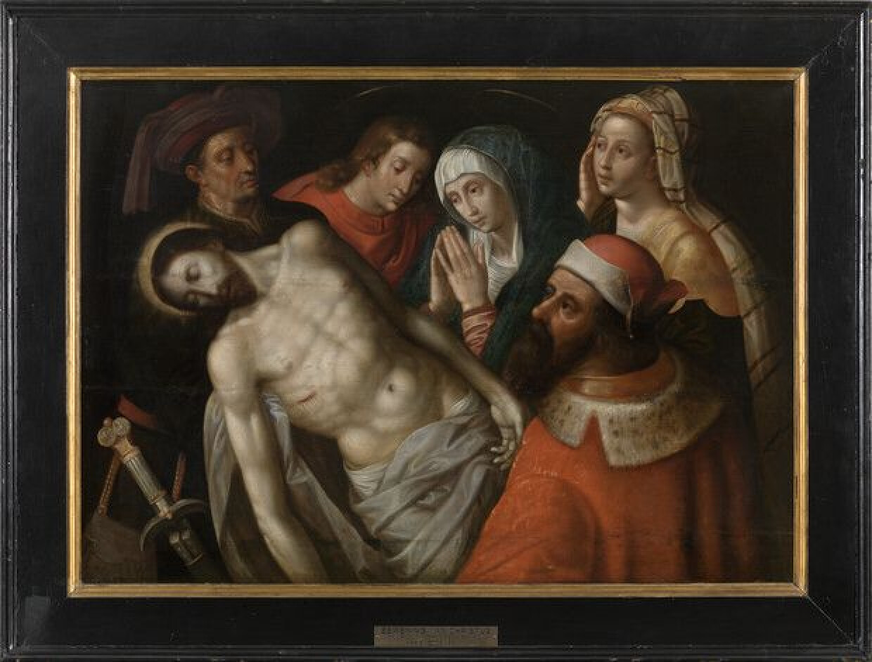 16de eeuwHet originele schilderij van Hugo van der Goes werd geschilderd op doek. Slechts een fragment ervan is overgebleven en wordt bewaard in Christ Church College in Oxford. Deze compositie was bijzonder populair en werd in de 16de en 17de eeuw veelvuldig gekopieerd. De directe confrontatie van de toeschouwer met een dergelijke voorstelling uit het lijdensverhaal van Christus moest inspireren tot een devoot leven. Het Sint-Janshospitaal bezit een vroeg-16de-eeuws exemplaar van deze compositie (0000.SJH0190.I). Het Groeningemuseum verwierf in 1992 een andere kopie (1992.GRO0031.I), van de hand van de Meester van de Lucialegende. Deze versie is van een heel andere aard. De achtergrond is donker gehouden, en de kleurrijke figuren komen sterker naar voren. Het werk heeft tevens een erg maniëristische inslag, voornamelijk in de behandeling van de gestorven Christus.