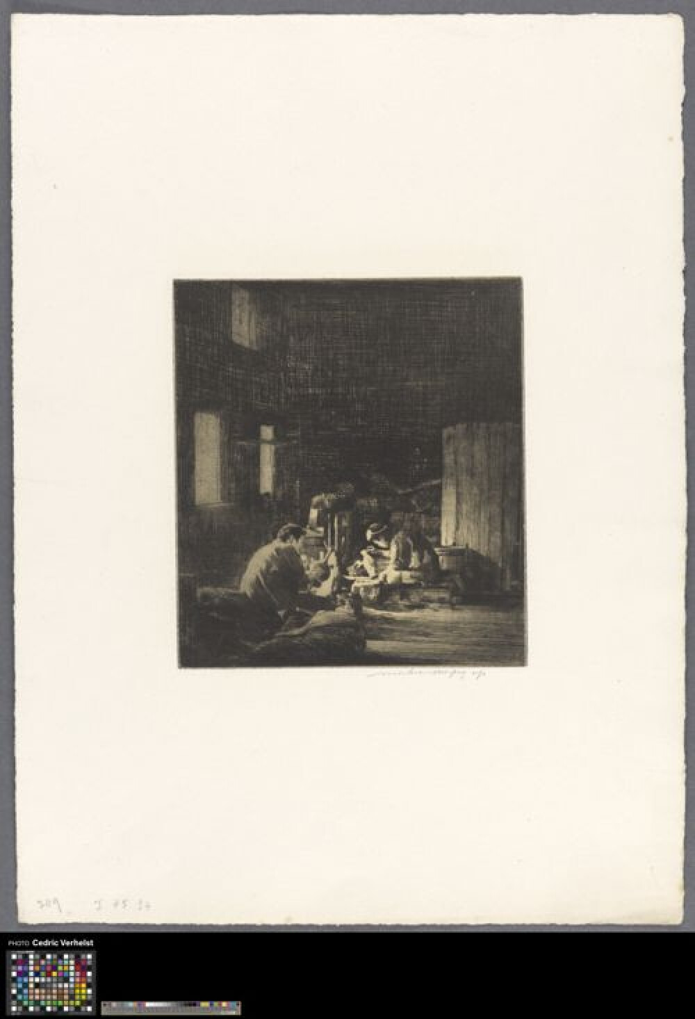 20ste eeuwDe prent toont een donker interieur waarin twee mannen bezig zijn met het bewerken van brons. Door enkele ramen links in de voorstelling komt wat licht de ruimte binnen, waardoor de bronswerkers verlicht worden. De man links in de voorstelling is vanop de rug gezien. In zijn rechterhand houdt hij een vaas vast om deze te bekijken. De man rechts in de voorstelling is in profiel naar links afgebeeld. Hij zit met gebogen rug op de vloer en kijkt naar de vaas die hij met zijn rechterhand omhoog houdt.