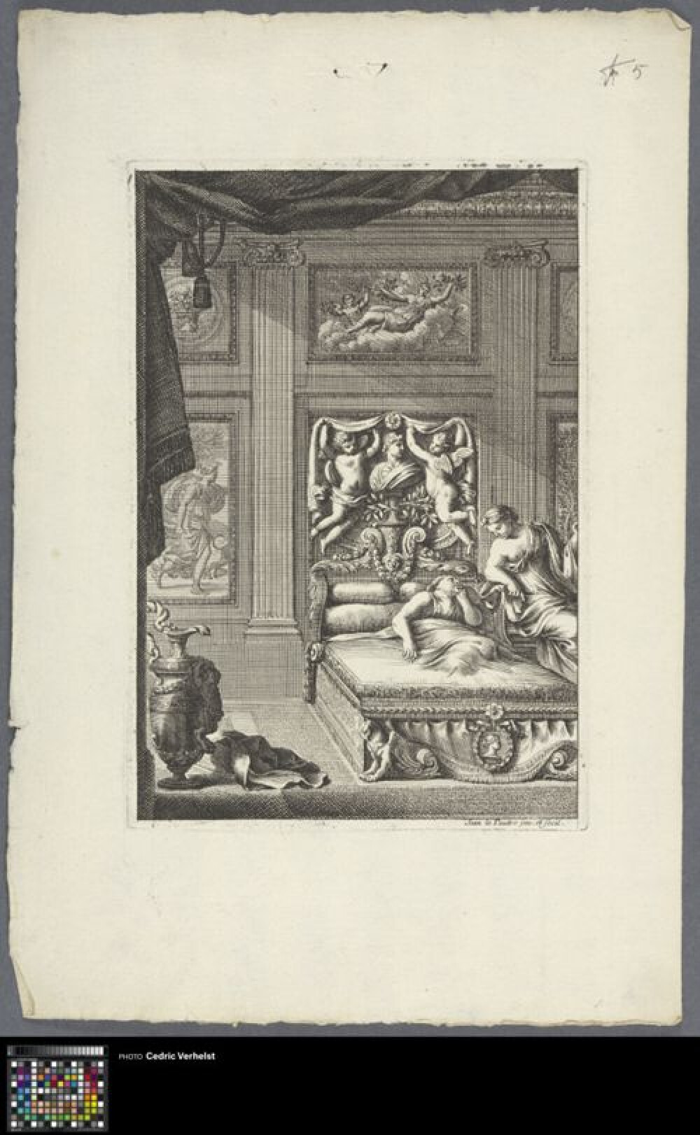 17de eeuwFrontispiece van een reeks met bedden in interieurs van Jean le Pautre getiteld Livre de lit a la Romaine.