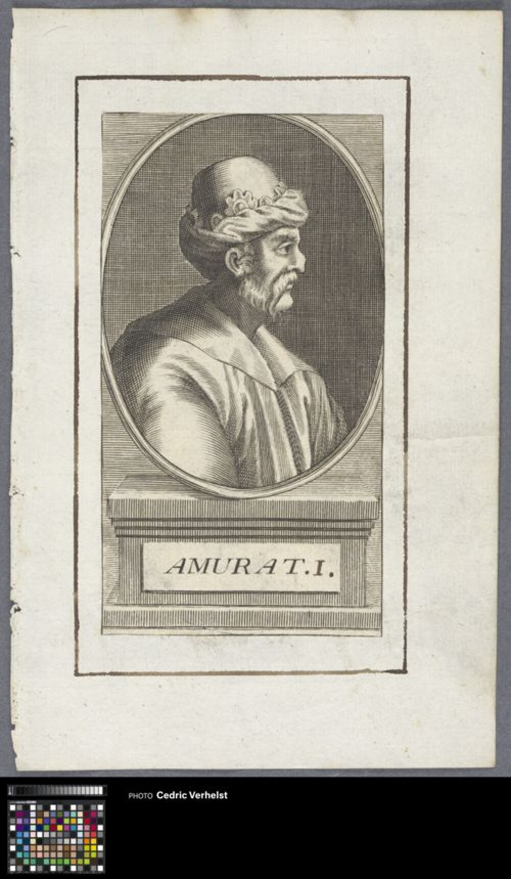 Busteportret van Murat IV (1612-1640), sultan van het Osmaanse rijk vanaf 1623. Hij draagt een tulband met bovenaan veren en heeft een snor en baard. Hij staat lichtjes gedraaid naar links. De prent is uitgesneden geweest.