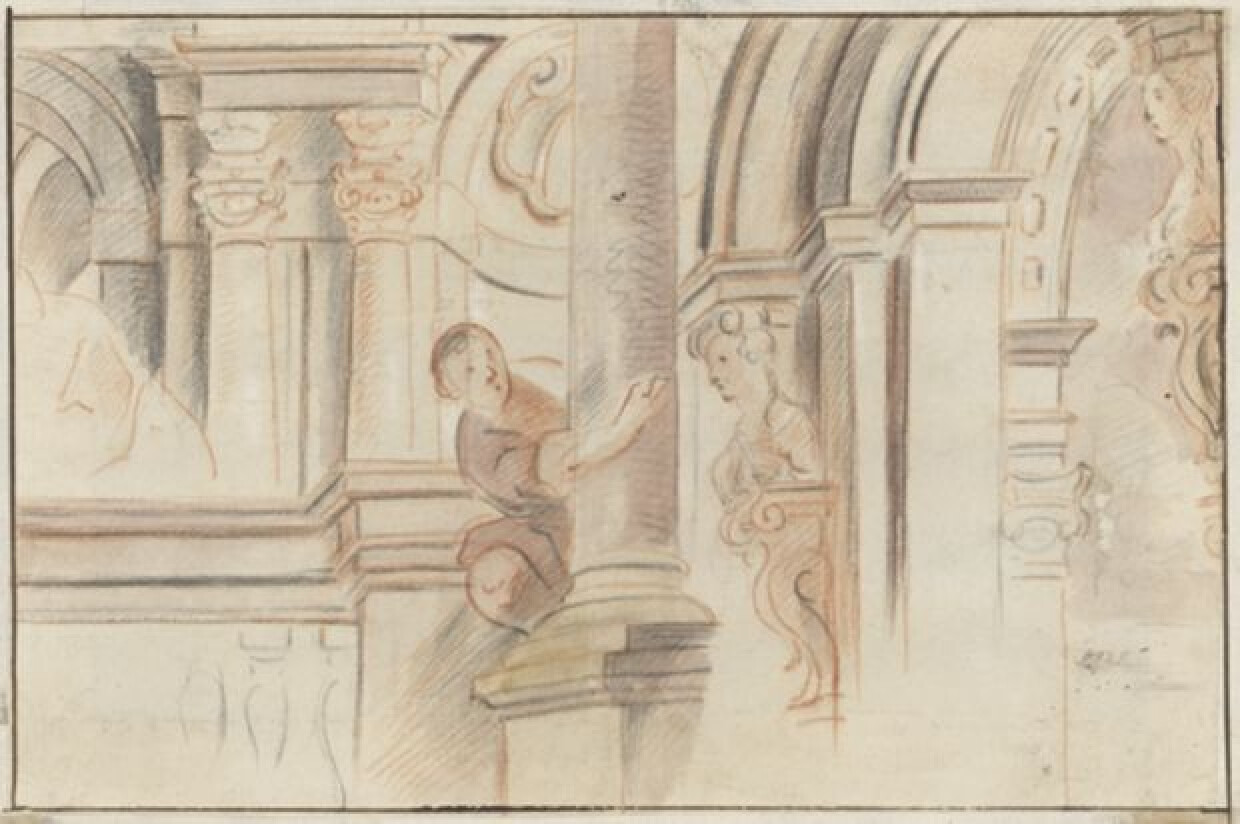 17de eeuwDe voorstelling toont een schets of studie van architecturale elementen, met centraal een figuur die een zuil of pilaar vasthoudt. De tekening is uitgevoerd in krijt en heeft een losse, schetsmatige stijl. Rondom zijn verschillende boogvormen te zien, waaronder een gedeelte van een portaal. De zuilen zijn versierd en kapitelen en hebben geen cannelures. Decoratieve elementen zijn afgebeeld in de vorm van cassetten, rolwerk of andere ornamentiek. De schets wekt de indruk van een klassieke of renaissancistische architectuurstijl. De tekening is in langdurig bruikleen van de Stichting Jean van Caloen (inv. nr. VCL 1825).