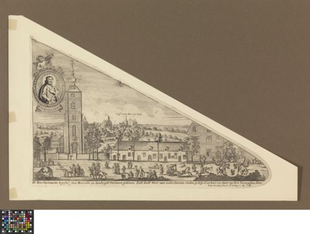 19de eeuw 20ste eeuwBedevaartvaantje van papier, H. Bartholomeus te Merksem. Rechthoekige driehoek van links naar rechts. Eénkleurig zwarte druk. Kopergravure uit 1679 van Gaspe Bouttats, in opdracht van Jean Kievits, de pastoor van 1638 tot 1688 te Merksem. Een zicht op de kerk met zijn weide omgeving. Op de toren van de kerk wapperen twee vlaggen met daarop het St. Andrieskruis. Naast de ommuurde kerk enkele kleine huizen en een herenhuis waar vermoedelijk een brouwer woont, gezien de tonnen ernaast. In de andere hoek van de kerk een vrouw bij een waterput en enkele dobbelaars voor de herberg. Op de achtergrond een vaag landschap met enkele gebouwen en het opschrift "t'hoff vandenheere van Parijs". Op de voorgrond een reeks personen en taferelen: militairen en burgers, ruiters, voetgangers, kinderen, een koets, een eierenverkoopster,... In de scherpe hoek rechts een wapenschild. In de linkerbovenhoek houdt een enkel een medaillon vast met daarop St. Bartolomeus, met mes in de hand, en omgeven door een stralenkrans.Onder het vaantje het opschrift 'H. Bartholomeus Apostel, van Merxem en dambrugh verheven patroon, Bidt Godt Voor uwe onderdaenen om den tydelycken hier en daer na den Eeuwighen loon Gaspe Bouttats fecit A°1679....JK'.
