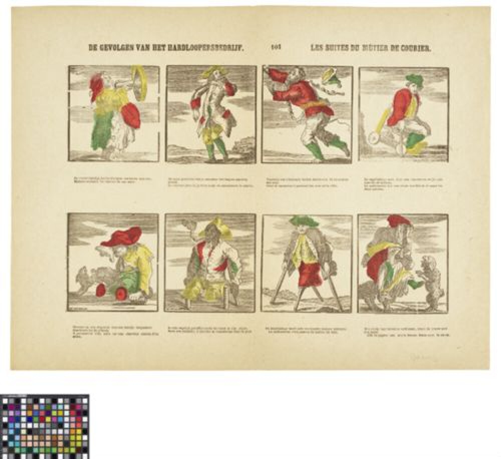 opschrift (boven de voorstelling): DE GEVOLGEN VAN HET HARDLOOPERSBEDRIJF. 101 LES SUITES DU MÉTIER DE COURIER.