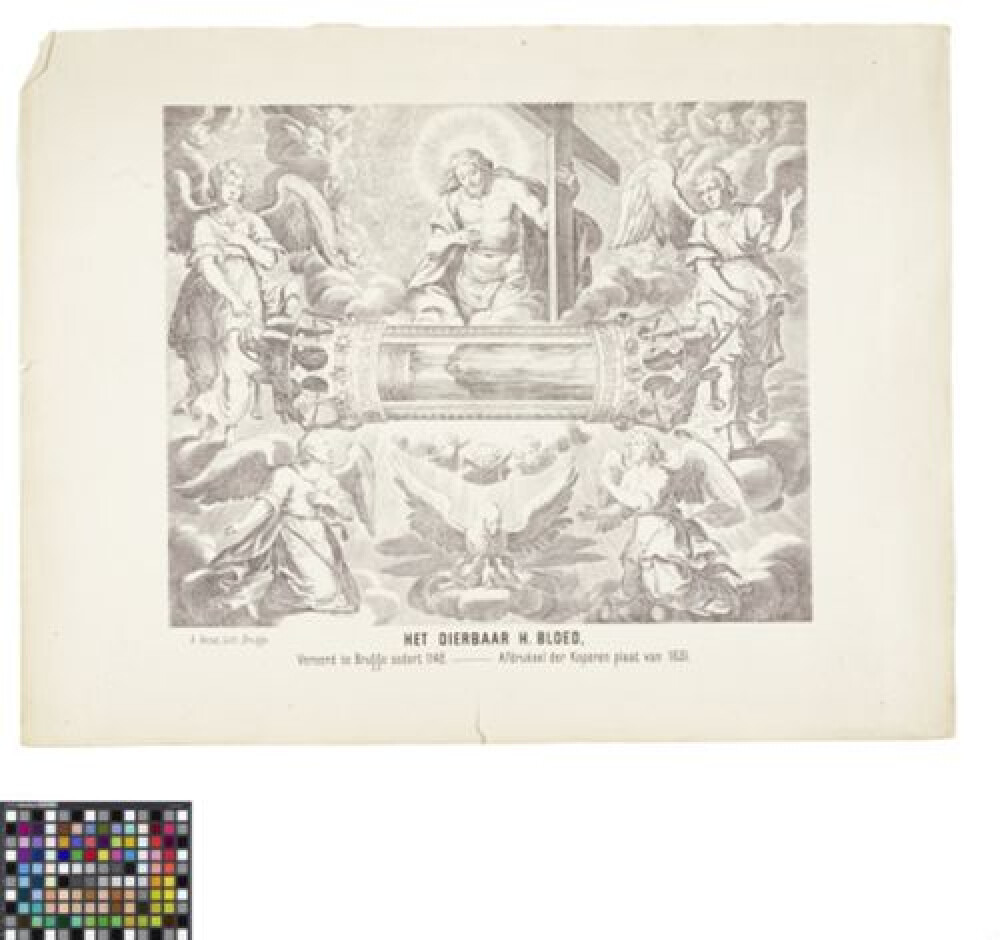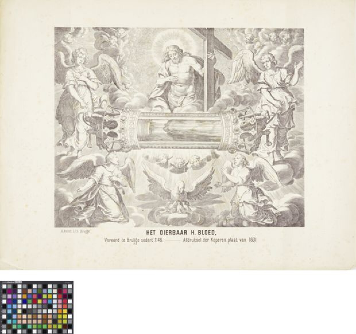 Op deze prent is de reliek van het Heilig Bloed te Brugge afgebeeld. Jezus bekijkt de reliek van boven uit, met zijn hand om het kruis geslagen. Er bevinden zich vele engelen in de wolkenmassa rondom hem. Twee daarvan houden aan linten de reliek op. Onderdaan twee aanbiddende engelen en de pelikaan die zichzelf in de borst pikt om zijn jongen te voeden. Dezelfde prent bevindt zich in de collectie van de basiliek van het Heilig Bloed. De prent is een lithografie uit de 19de eeuw. van A. Ancot. Het ontwerp is overgenomen van een gravure uit 1631. De compositie is exact dezelfde als die van zes andere prent in de collectie.