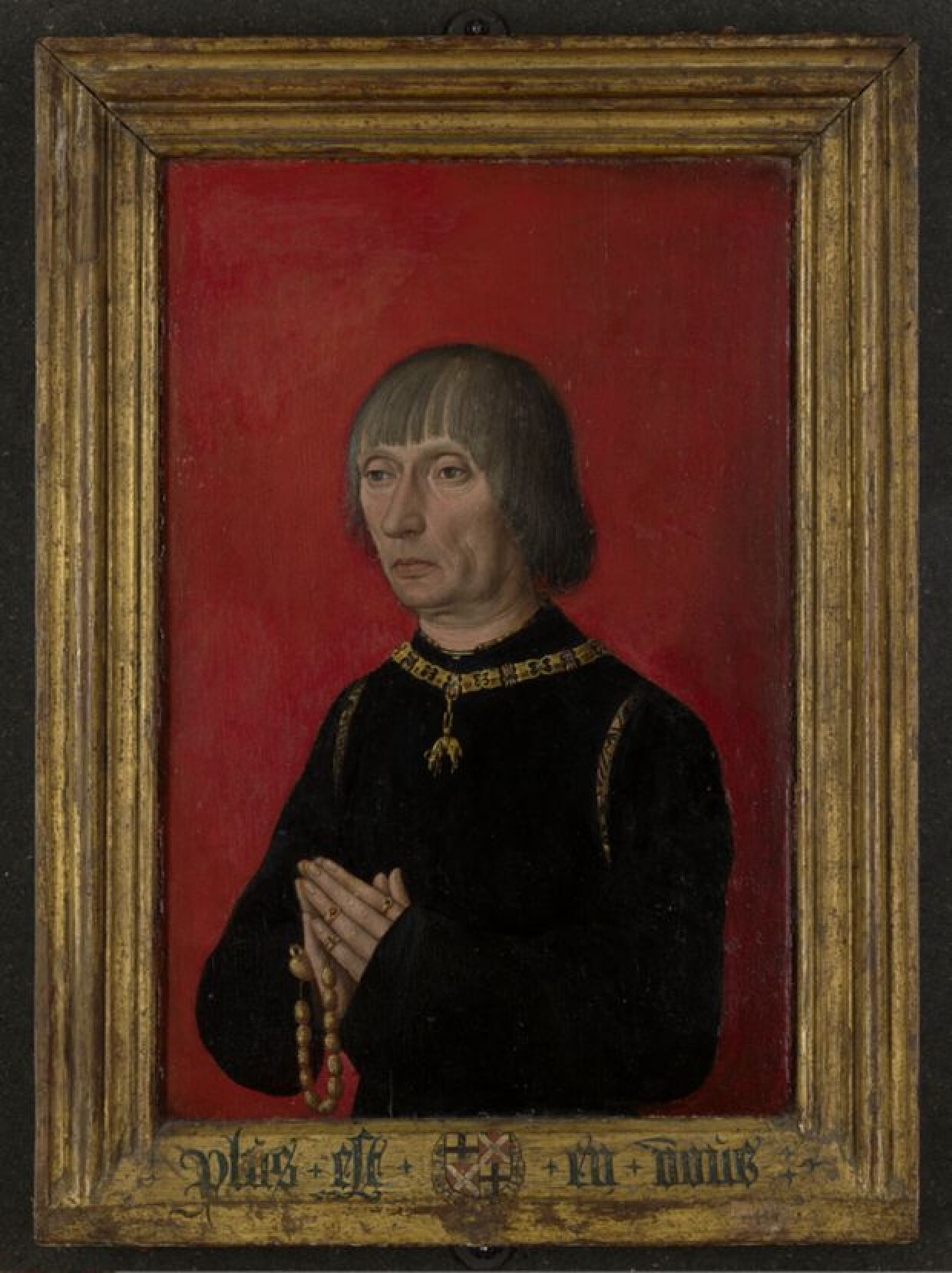 15de eeuwHet blazoen en het motto 'plus.est.en.vous' onderaan op de lijst maken de identificatie van de man mogelijk. Het is Lodewijk van Brugge, heer van Gruuthuse en kamerheer van Filips de Goede en Karel de Stoute. Hij was ook ridder van het Gulden Vlies, zoals ook blijkt uit de halsketting die hij op het schilderij draagt. Na een opmerkelijke politieke carrière valt hij echter in ongenade bij Maximiliaan van Oostenrijk. De houding van de figuur en de scharniersporen in de lijst aan de linkerkant wijzen er op dat dit portret een rechterluik was. Mogelijk was het oorspronkelijke geheel een diptiek met aan de linkerzijde de voorstelling van Maria met het Jezuskind.