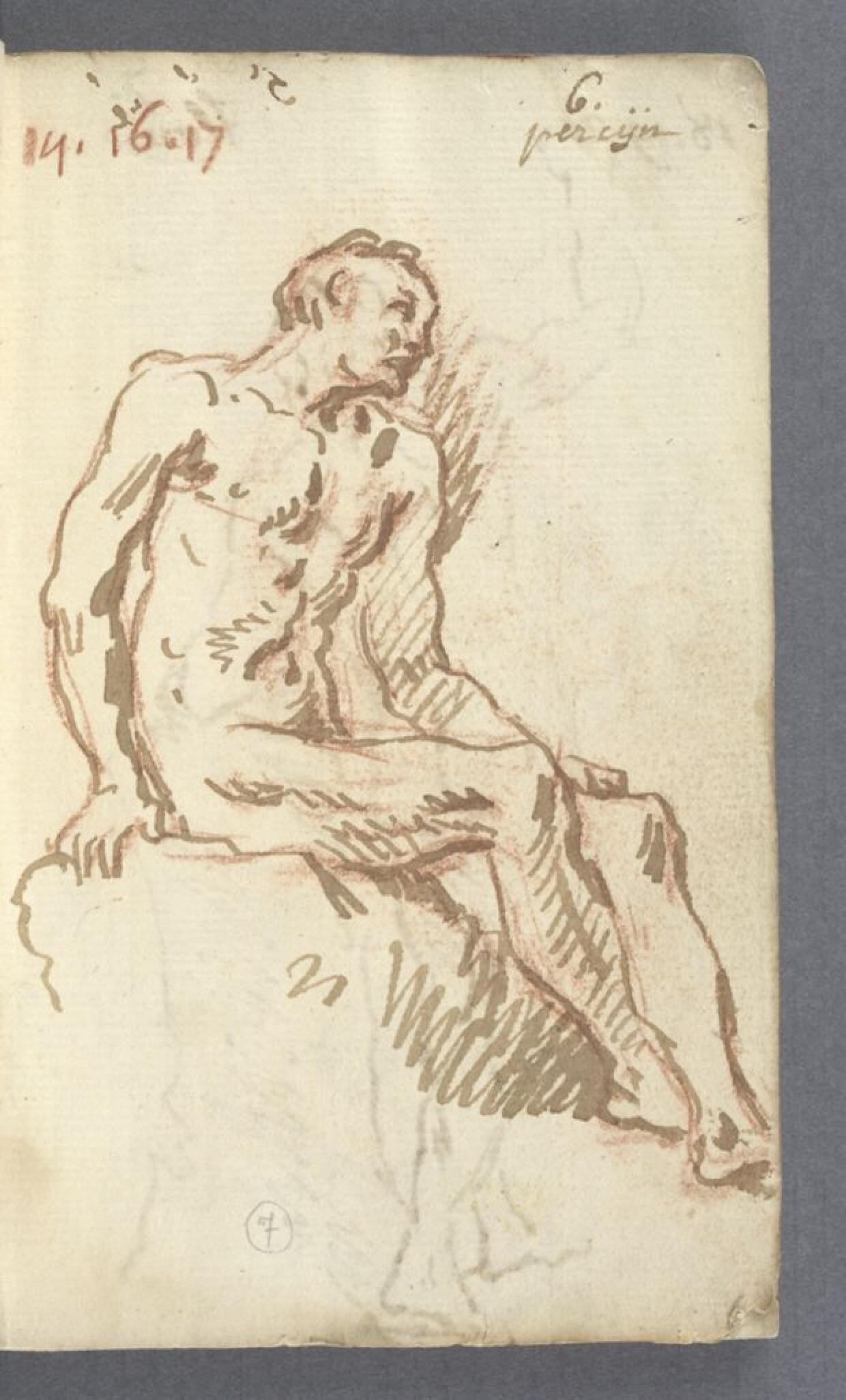 18de eeuwZevende bladzijde [vierde blad, recto] uit een notitieboekje van Jan Garemijn als directeur van de Brugse Academie, daterend uit het schooljaar 1767-1768. De pagina bevat een schets van een mannelijk naakt, zittend op een rotsblok en in profiel naar rechts afgebeeld. Het bovenlichaam is gedeeltelijk naar de toeschouwer gedraaid, terwijl het hoofd in profiel is weergegeven. Zijn rechterarm loopt naast het lichaam en zijn hand steunt op de blok. Zijn linkerhand ligt op zijn linkerbovenbeen. Een eerste vluchtige aanzet is in rood krijt uitgevoerd. Daarover staat een meer uitgewerkte tekening in bruine inkt, met aanduiding van de schaduwdelen door arcering. Het gaat om de zesde actie uit de klas naar model, geposeerd door het model Percijn op 14, 16 en 17 november 1767.