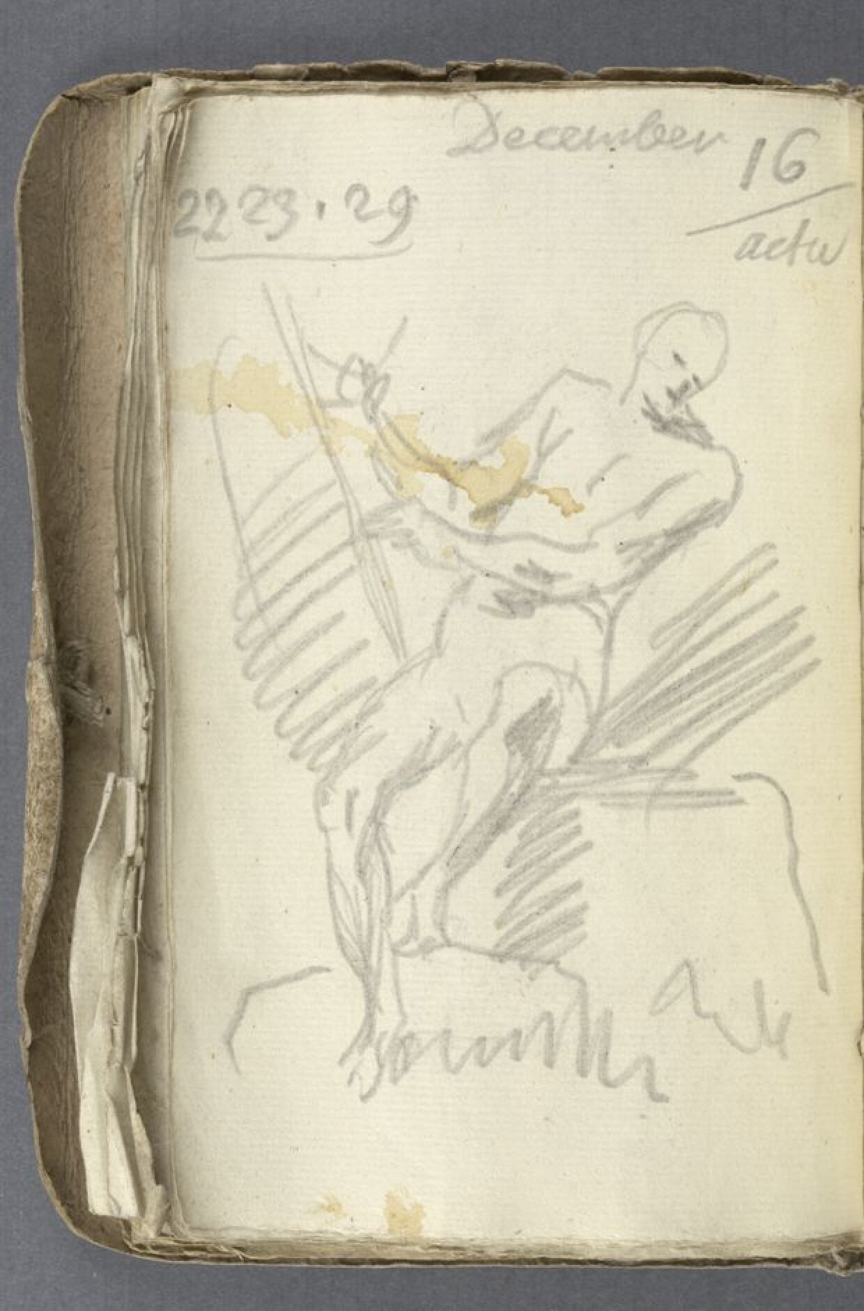 18de eeuw56ste bladzijde [blad 28, verso] uit een notitieboekje van Jan Garemijn als directeur van de Brugse Academie, daterend uit de schooljaren 1771-1772 en 1774-1775. Schets van een zittend mannelijk naakt, frontaal weergegeven. Het model zit op een sokkel, opzij leunend naar zijn linkerkant. Hij kijkt in de richting van zijn linkerschouder naar onder, en buigt zijn torso mee. Zijn linkerarm is gekruist voor het lichaam weergegeven. De man lijkt voor een canvas te zitten, tekenend met zijn rechterhand. Zijn rechterarm is hierbij geplooid. Beide benen zijn gebogen maar het rechterbeen maakt een minder scherpe hoek. Zijn linkervoet staat dan ook iets hoger op een sokkel. De schets is gemaakt in grijs potlood. Garemijn suggereerde de spieren en schaduwzones met arceringen. Het gaat om de zestiende actie van het schooljaar 1774-1775, geposeerd op 22, 23 en 29 december 1774.