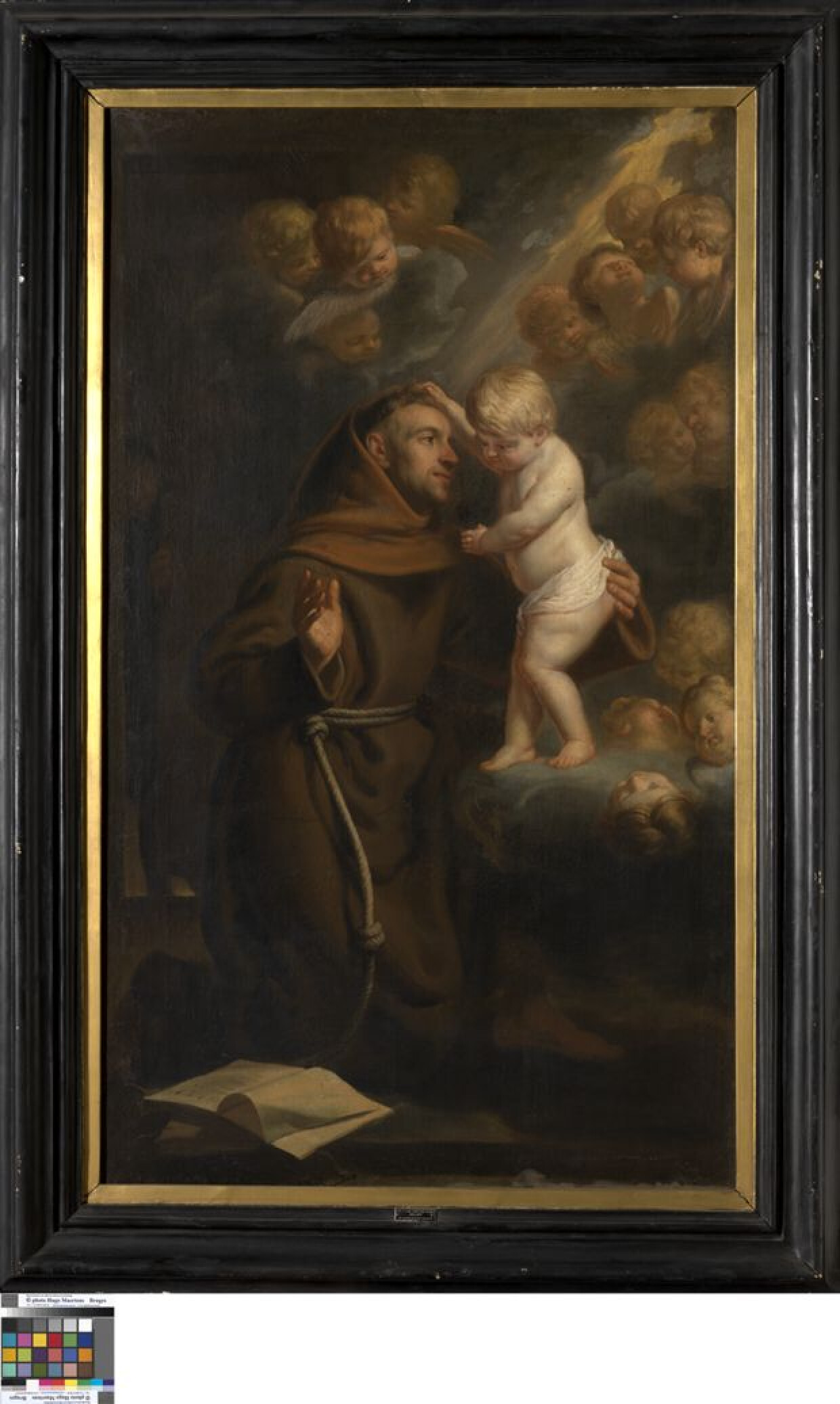 17de eeuwIn een van de oudst bekende levenslegenden, het Liber Miraculorum van 1360, wordt verhaald dat Antonius, tijdens een reis door Frankrijk, in een visioen de Madonna met het Kind Jezus zag. Dit schilderij gaat terug op dit verhaal en toont de heilige in een een geijkte voorstelling: knielend voor het Kind Jezus, dat voor hem verschijnt op een wolk omgeven door engelenhoofdjes. Het lokale coloriet en de zilverachtige belichting herinnert aan de andere schilderijen van Jacob van Oost I uit de jaren 1640. Het werk is waarschijnlijk, samen met het gerelateerde werk met een andere scène uit het leven van de heilige Antonius (0000.GRO0178.I), vervaardigd voor de Brugse Minderbroederskerk. (Naar: H. Vlieghe, Stedelijke Musea Brugge. Catalogus Schilderijen 17de en 18de eeuw, Brugge, 1994, pp. 199-200.)