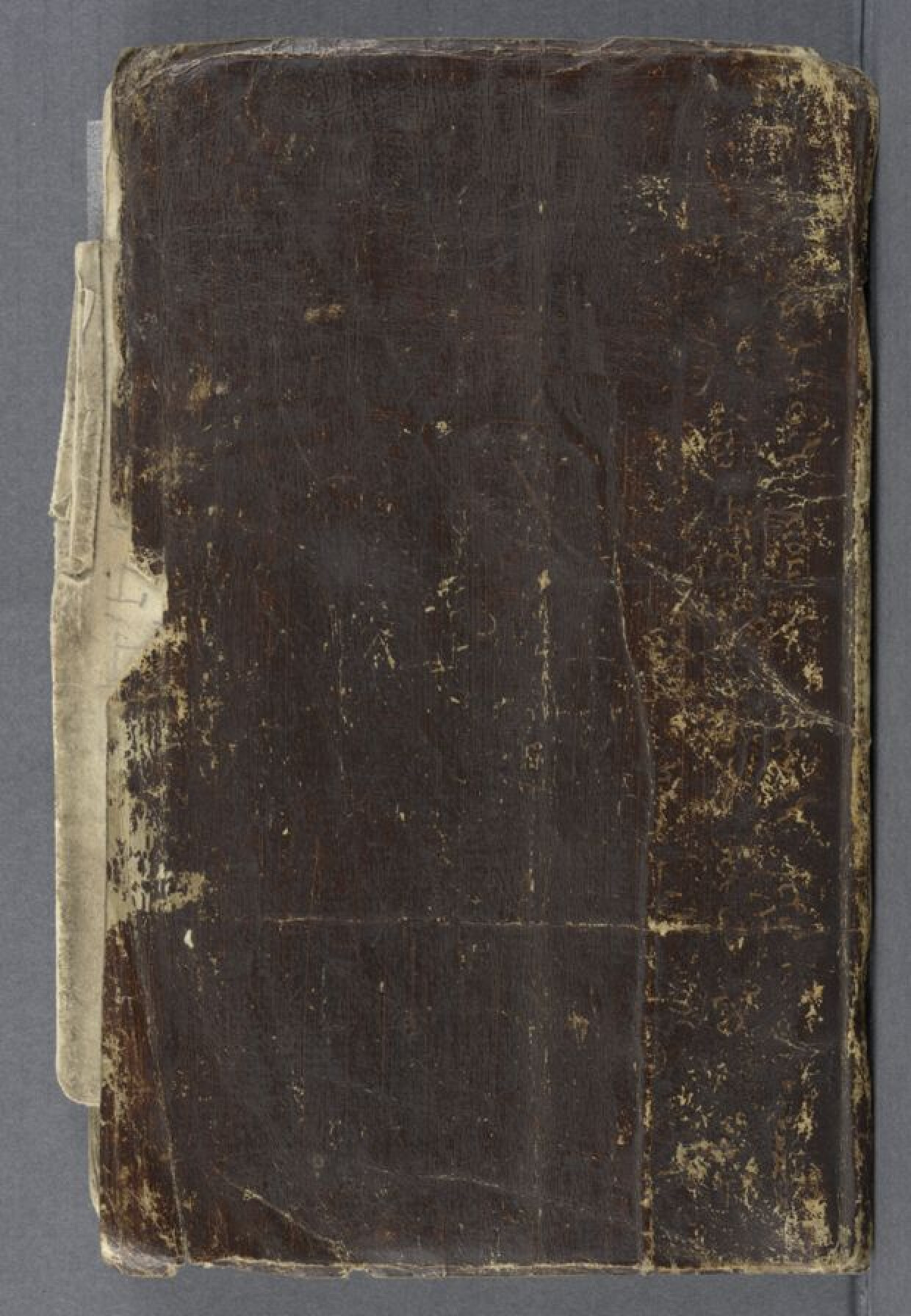 18de eeuwAchterplat van een notitieboekje van Jan Garemijn als directeur van de Brugse Academie, daterend uit het schooljaar 1766-1767. Het gaat wellicht om een maculatuur of hergebruik van perkament, waarop een tekst in sierlijk schrift gecamoufleerd werd, mogelijks met lijm. Dit zou de bruine kleur verklaren.