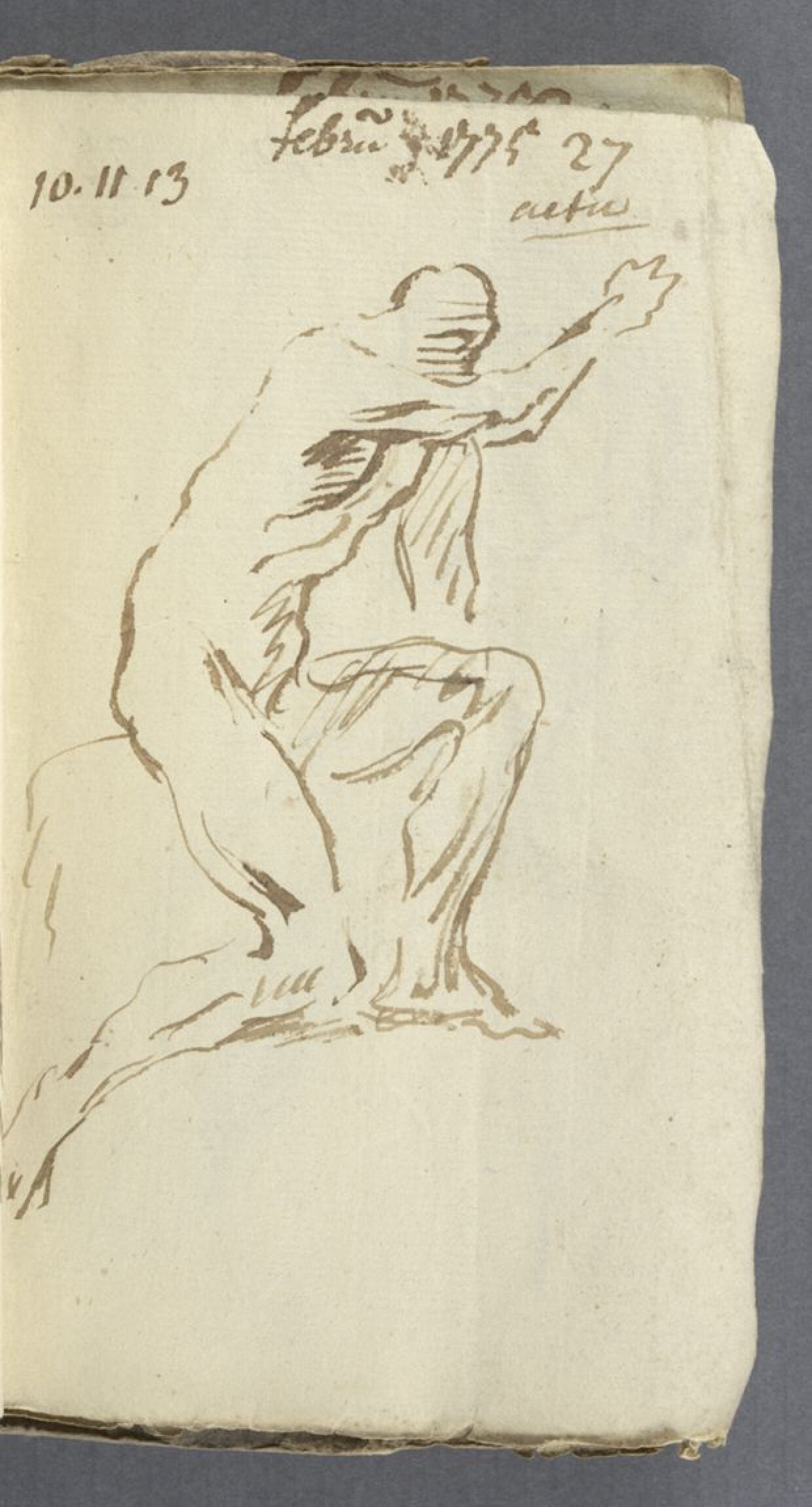 18de eeuw67ste bladzijde [blad 34, recto] uit een notitieboekje van Jan Garemijn als directeur van de Brugse Academie, daterend uit de schooljaren 1771-1772 en 1774-1775. Vluchtige schets van een zittend mannelijk naakt in profiel naar rechts. Het model zit op een blok, het bovenlichaam licht naar voren hellend. De rechterarm is geplooid en hij houdt zijn hand iets hoger dan het hoofd. De linkerarm is aangezet maar niet verder uitgetekend. Deze arm hangt wellicht ontspannen naar beneden. Beide benen zijn geplooid. De man steunt op zijn linkervoet, terwijl het rechterbeen met het scheenbeen op de grond ligt. In het linkerbeen, de linkerarm, het hoofd en de rechteroksel zijn arceringen aangebracht. Hiermee duidde Garemijn de schaduwzones aan. De schets is gemaakt in bruine inkt. Het gaat om de 27ste actie van het schooljaar 1774-1775, geposeerd op 10, 11 en 13 februari 1775.