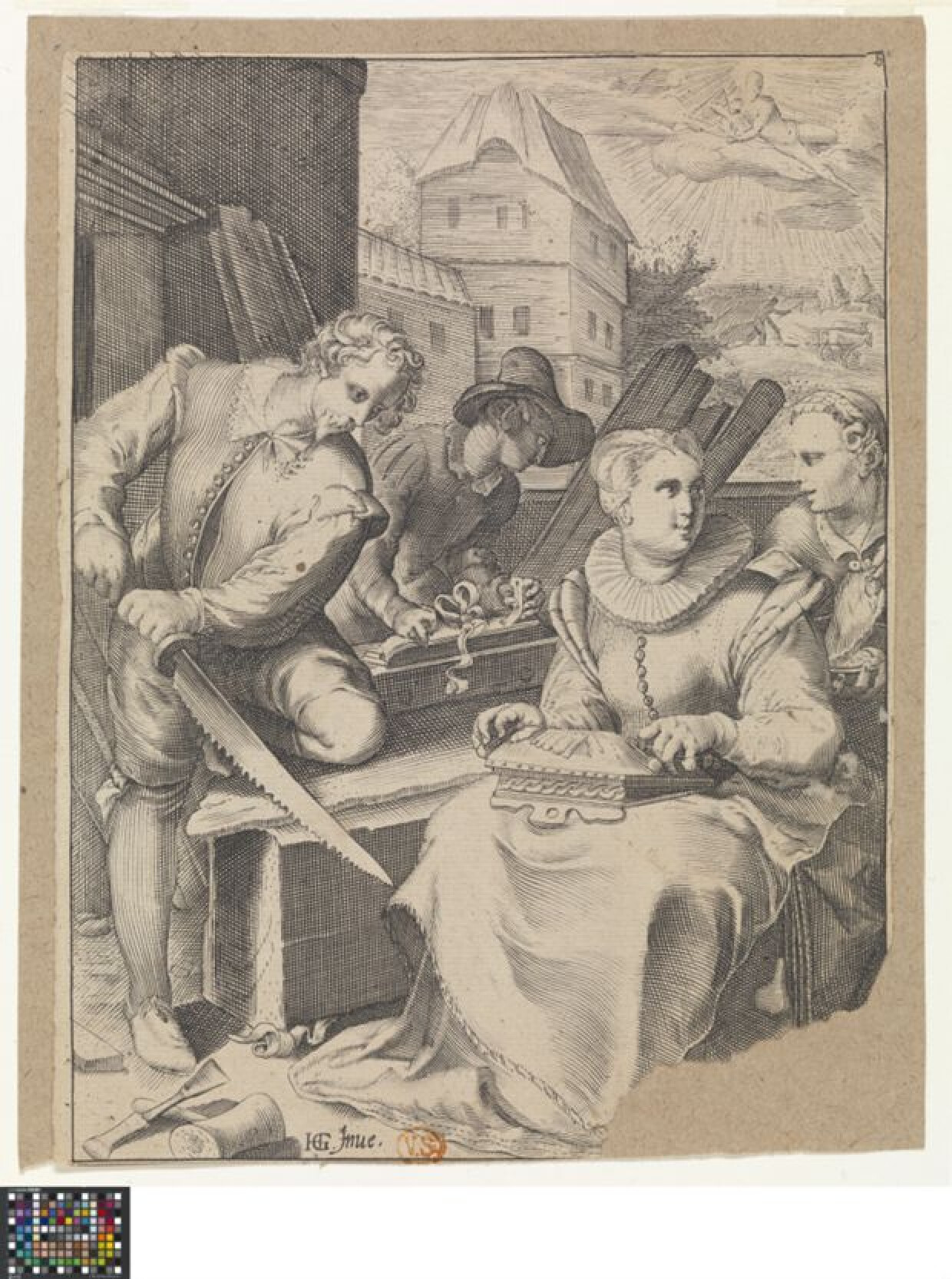 16de eeuw'Middag' is de derde prent in Goltzius' reeks 'De vier getijden van de dag'. De scène in de voorgrond toont enkele mensen aan het werk: een timmerman en zijn gezel zijn in de weer met een meubel, terwijl een vrouw kant maakt en haar dienstmeisje richtlijnen geeft. In de verte bewerkt een boer zijn land. Rechtsboven in de achtergrond zweeft de personificatie van de middag. In tegenstelling tot voorgaande series met de vier daggetijden, ligt de nadruk bij Goltzius veel meer op de menselijke activiteiten dan op de allegorische personificatie. plaatranden afgesneden. (New Hollstein 686)