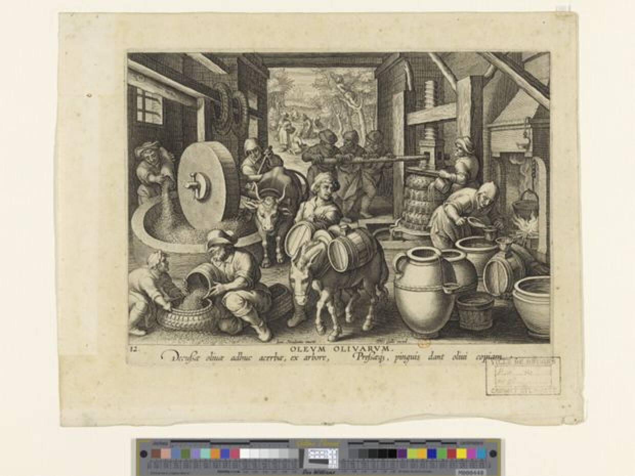 16de eeuwDeze prent toont de olijfpers als nieuwe uitvinding van de vroegmoderne tijd. Het is de twaalfde prent in een reeks van negentien excl. titelprent (New Hollstein, Johannes Stradanus, part III, 322-341, 334.II).