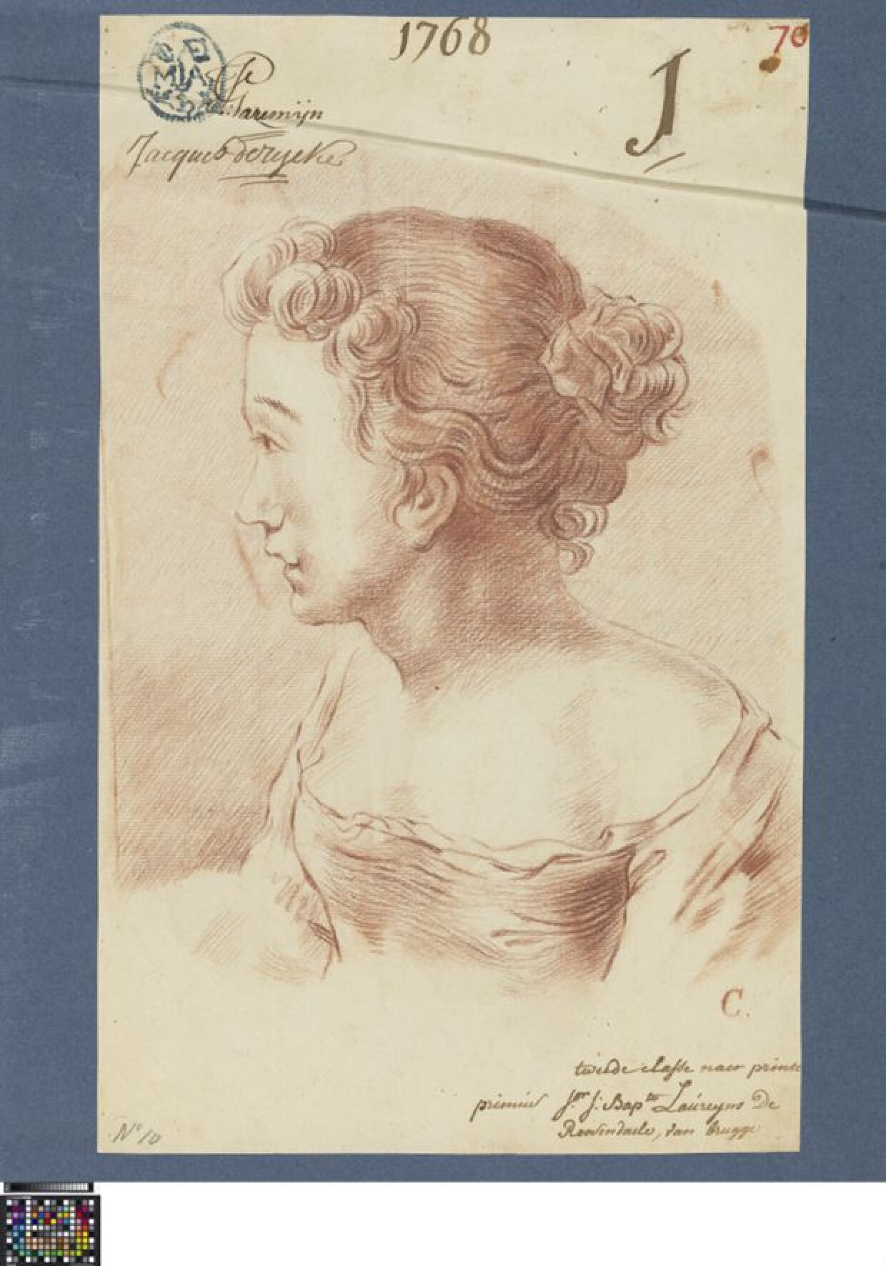 18de eeuwAcademische studie naar prent van een jonge vrouw, getekend in rood krijt door Jean-Baptiste Lauwereyns de Roosendaele. Hij tekende deze studie tijdens de prijskamp van 1768 aan de Academie Brugge en won de eerste prijs. Hij was toen leerling in de tweede klas naar prenten bij leraar Jacques de Rijcke. Er werd getekend naar een prent waarop een vrouw afgebeeld is in profiel naar links. Ze is weergegeven tot aan de middel en draagt een jurk met een diepe ronde hals. Linksboven is de academiestempel op het papier gedrukt met daarnaast de handtekening van directeur Jan Garemijn en leraar de Rijcke. Rechtsboven staat het tekennummer van Lauwereyns. De letter C onderaan werd wellicht toegewezen voor anonieme jurering. De studie wordt bewaard in een album met andere prijstekeningen naar prenten.