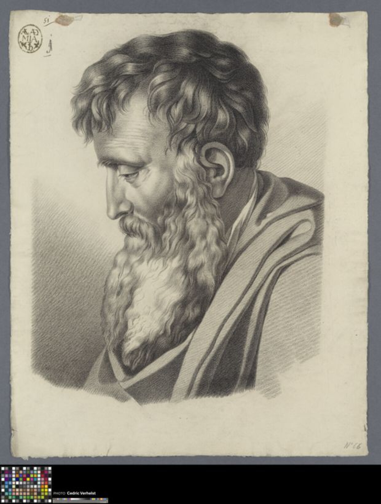 19de eeuwAcademische studie naar prent van de heilige Jozef, getekend door een onbekende kunstenaar tijdens zijn studie aan de Academie Brugge. Deze leerling volgde les in een van de klassen naar prenten, wellicht de eerste of tweede klas. Een oudere man is afgebeeld tot aan de borst, in profiel naar links. Hij heeft een lange baard en draagt een kleed of gewaad. Hij houdt zijn hoofd wat naar voren gekanteld, zijn blik naar beneden gericht. Deze studie werd getekend naar een prent van Lucien, naar ontwerp van Le Barbier (tekenaar). Een overeenkomstige prent wordt bewaard in het prentenkabinet van de KBR (S.II 101286). Deze prent heeft als titel 'St. Joseph', wat maakt dat deze oudere man als de heilige Jozef geïdentificeerd kan worden. Op de tekening staan verschillende aantekeningen gerelateerd aan een wedstrijd op de Academie Brugge. In de linkerbovenhoek is de academiestempel te zien. Het nummer '51' is het tekennummer van de leerling-tekenaar waarmee de wedstrijdjury zijn studie anoniem kon beoordelen. Na hun verdict werd linksboven een 'j.' aangebracht. Zo weten we dat deze leerling eerste werd. Helaas bevat deze studie geen datering of handtekeningen. Zo kon dus niet achterhaald worden welke leerling deze tekening maakte, wanneer en voor welke wedstrijd werd getekend: om prijs of om plaatsen. Het watermerk bevat wel een jaartal (1812), al is dit geen nauwkeurige indicatie voor de datering. De tekening maakt deel uit van een album waarin wedstrijdtekeningen naar prenten zijn bewaard.