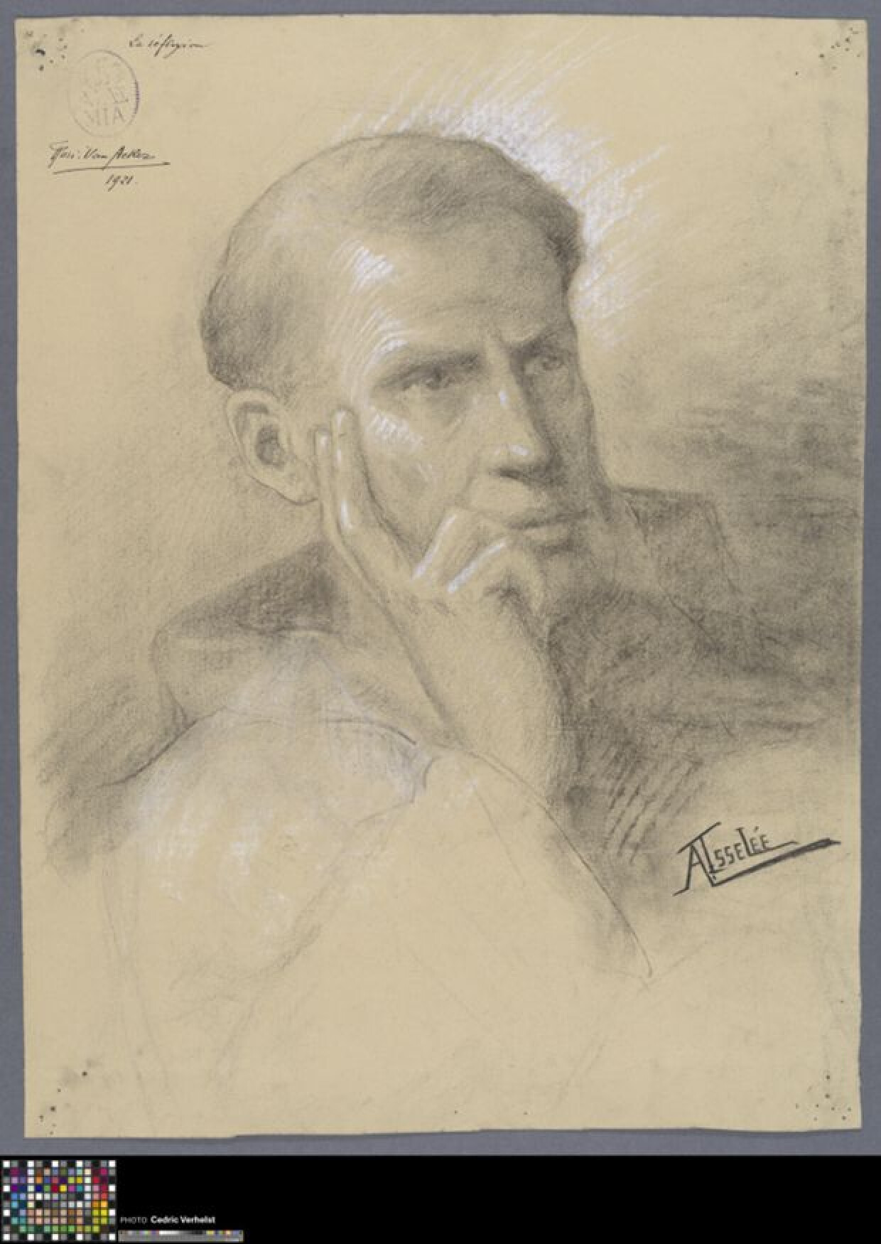 20ste eeuwAcademische expressiestudie van een mijmerende of nadenkende man, getekend door A. Isselée in 1921. De aantekening linksboven benoemt deze studie als 'La réflexion'. De man houdt zijn rechterhand in nadenkende houding tegen zijn gezicht en kijkt in driekwart aanzicht naar rechts. Op de verso zien we een schets van dezelfde studie. Het gebruikte medium is zwart krijt of houtskool met hoogsels in wit krijt. Wellicht tekende Isselée deze studie voor een wedstrijd aan de Academie Brugge. Linksboven staat de academiestempel met de handtekening van directeur Flori Van Acker.