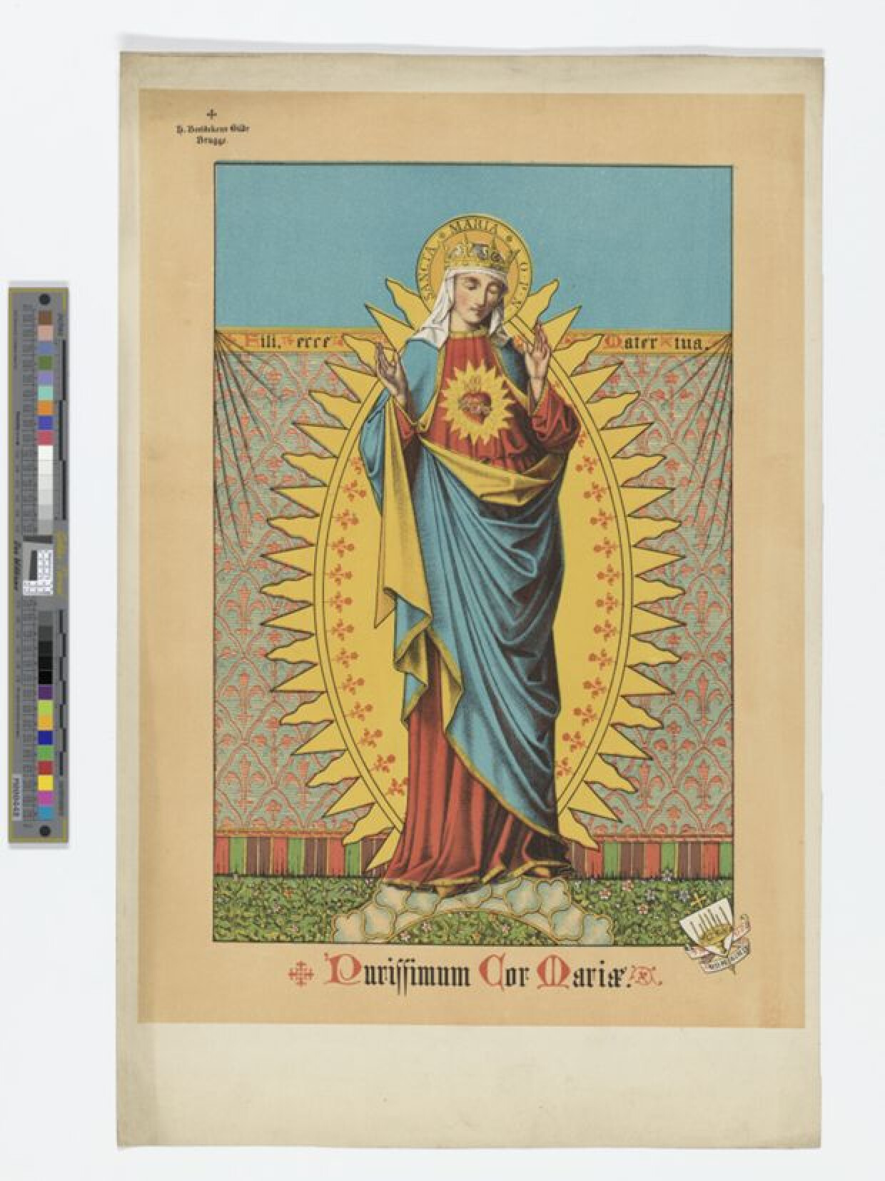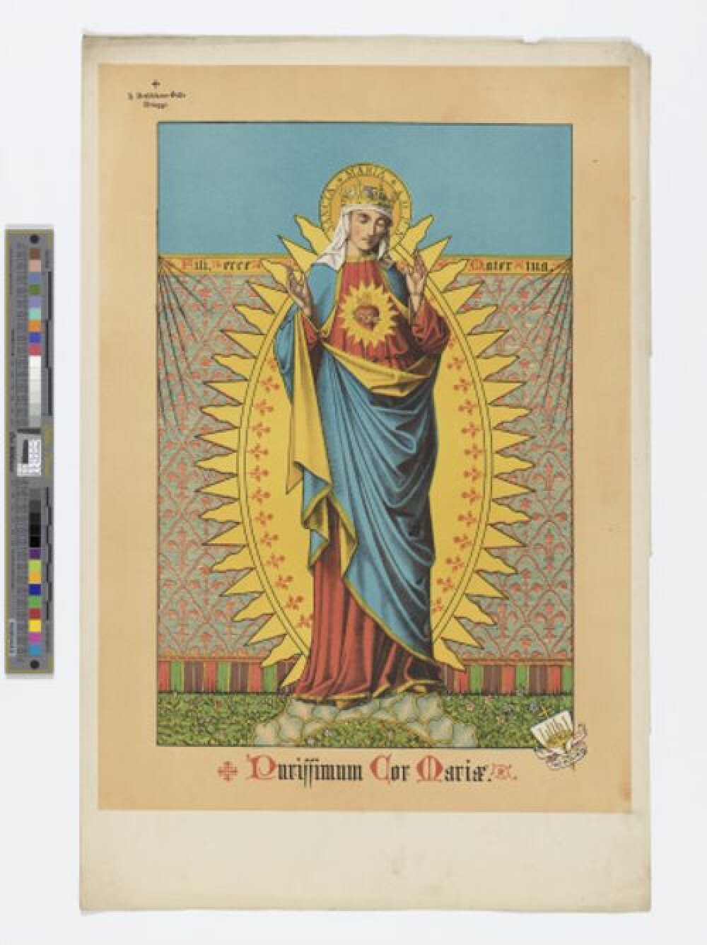 19de eeuwDevotieprent in neogotische stijl van Maria. De prent werd uitgegeven door uitgeverij Van de Vyvere-Petyt en de ‘Heilige Beeldekensgilde’. Met de oprichting in 1864 van de Heilige Beeldekensgilde (door o.m. kan. Adolf Duclos, Guido Gezelle en Joseph Neurath) drong de neogotiek definitief door in het Brugse drukwerk. De koploper in deze evolutie was de lithograaf Jakob Petyt (1822-1871). Sinds 1844 had hij zijn atelier in Brugge opgestart waar hij vanaf 1864 neogotisch drukwerk leverde. Na zijn dood, in 1871, nam zijn weduwe het bedrijf over. Vanaf 1875 kwam het bedrijf in handen van haar schoonzoon Karel Van de Vyvere-Petyt (1852 - 1922) tot 1914. Neogotische (bid)prentjes, diploma's en ander religieus drukwerk in kleurenlithografie vormden het handelsmerk van deze drukkerij.