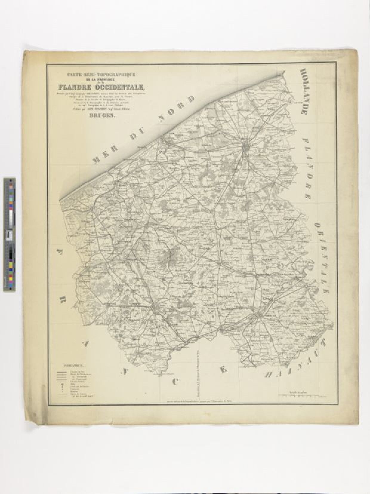 19de eeuwKaart van West-Vlaanderen, met onderaan een legende waarop de wegen en spoorwegen aangeduid staan en rechtsonder de schaal aangegeven is.