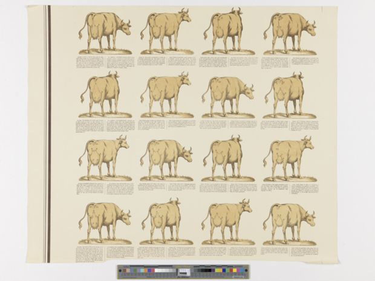 19de eeuwLithografie uit een reeks van 6 dezelfde affiches bestaande uit 6 prenten over de eigenschappen van goede en slechte melkkoeien met letteraanduidingen op de prent die de verschillende kenmerken aangeven. Onder elke afbeelding op de prenten staat de uitleg in het Nederlands en het Frans. Deze prent is gedrukt op een gele achtergrond. Deze prent is het linker middendeel van de affiche.