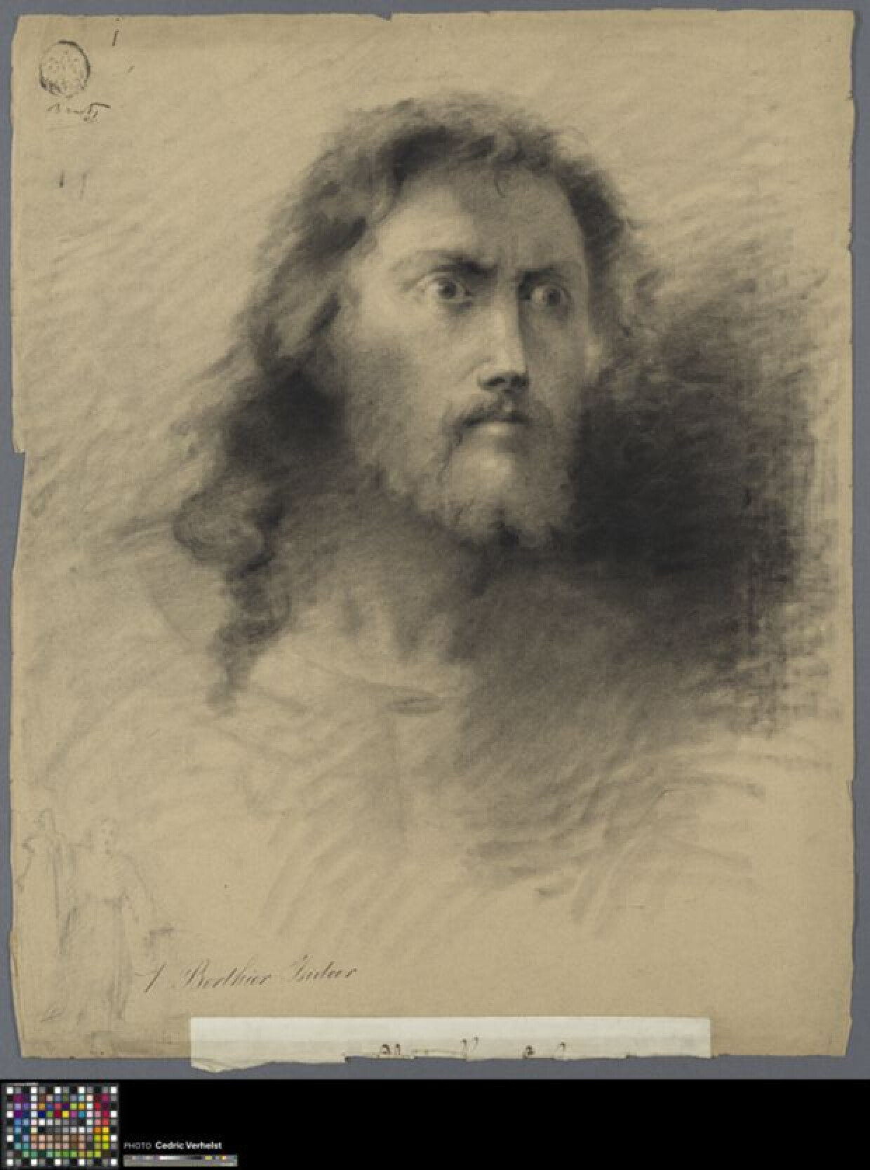 19de eeuwAcademische expressiestudie gemaakt door Isidoor Bertier. Hij maakte deze studie voor een wedstrijd aan de Academie Brugge in de categorie 'uitdrukking'. De exacte vervaardigingsdatum is onbekend maar ligt vermoedelijk tussen 1874 en 1881. In die periode volgde Bertier eerst les in de klassen naar het antiek en daarna in de klas naar levend model. Enkel leerlingen uit deze klassen konden deelnemen aan de prijswedstrijd in de categorie 'uitdrukking'. Een man met lang haar en gesplitste baard is tot aan de schouders weergegeven. Linksonder is een schets te zien van de volledige figuur waarvan de tekening een gedetailleerde uitwerking is. Zo blijkt dat de man een lang kleed draagt en een staf of stok bij zich heeft. Met een frons, grote ogen en strenge blik, lijkt hij volledig verstard te zijn. Wellicht gaat het om een detail uit een schilderij. Het gebruikte medium is zwart krijt of houtskool. In het rechteroog is met wit krijt een lichtpuntje aangebracht. De aantekeningen duiden op Bertiers wedstrijddeelname. Linksboven is de academiestempel te zien, met daarbij zijn toegewezen letter 'i'. Dat hij eerste werd, noteerde men nadien linksonder. Aan het tekenpapier is onderaan een wit etiket verlijmd. Door beschadiging is de aantekening erop onleesbaar.