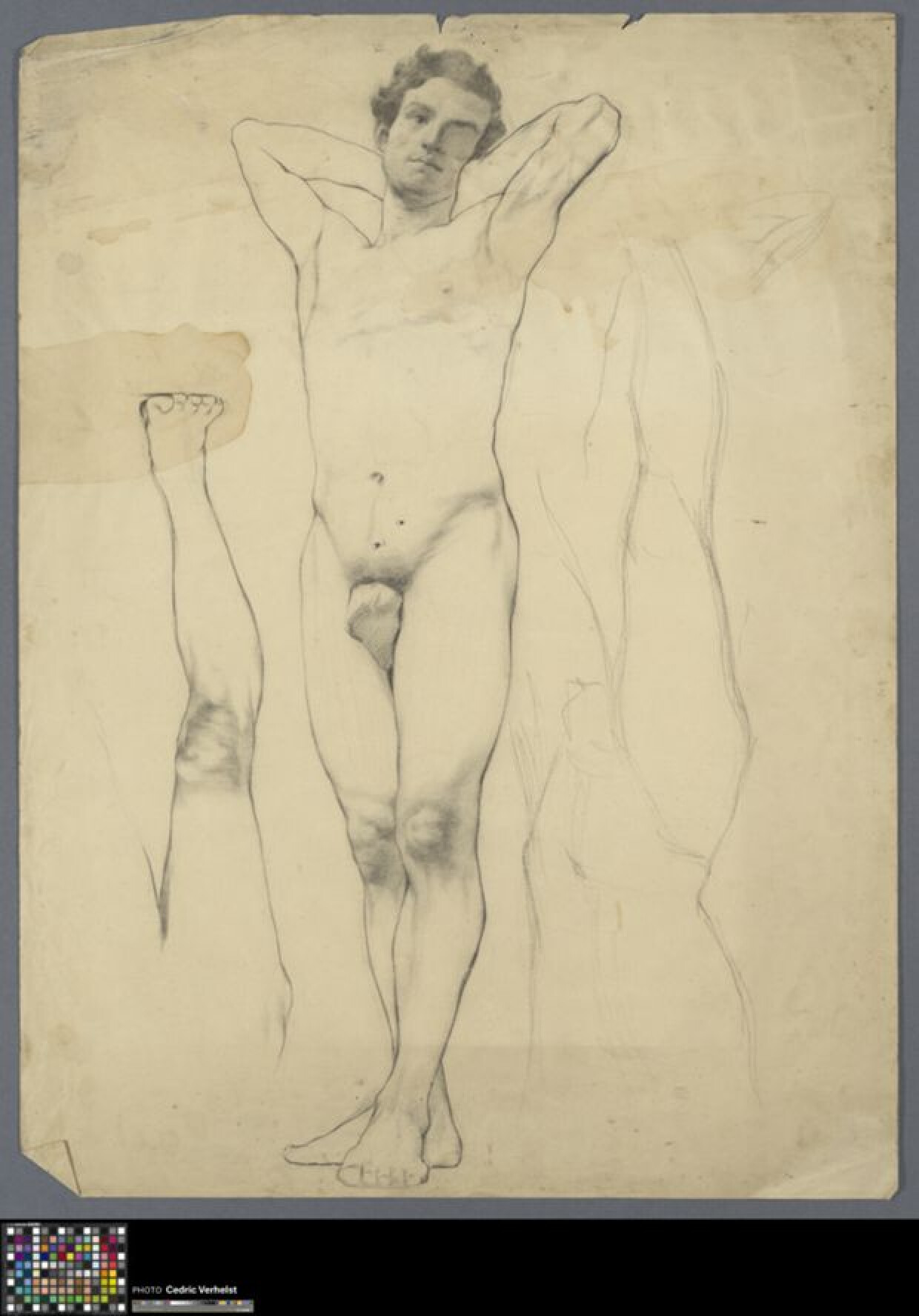 19de eeuw 20ste eeuwAcademische studie naar levend model van een staande naakte man. Het gebruikte medium is zwart krijt of houtskool. De naam van de tekenaar en de vervaardigingsdatum zijn niet gekend. Het gaat om een lijntekening met minimale schaduwvoering. Het model is frontaal getekend. De man houdt zijn armen achter zijn hoofd en kijkt voor zich uit. Zijn hoofd is verder uitgewerkt met schaduw en diepte, net als de zones rond zijn lenden, heupen en knieën. Het linkerbeen van het model is een tweede maal geschetst met uitwerking van de kniezone. Rechts van het model staat een voorbereidende schets. Op de achterzijde is de vorm van een voet met snelle lijnen geschetst.