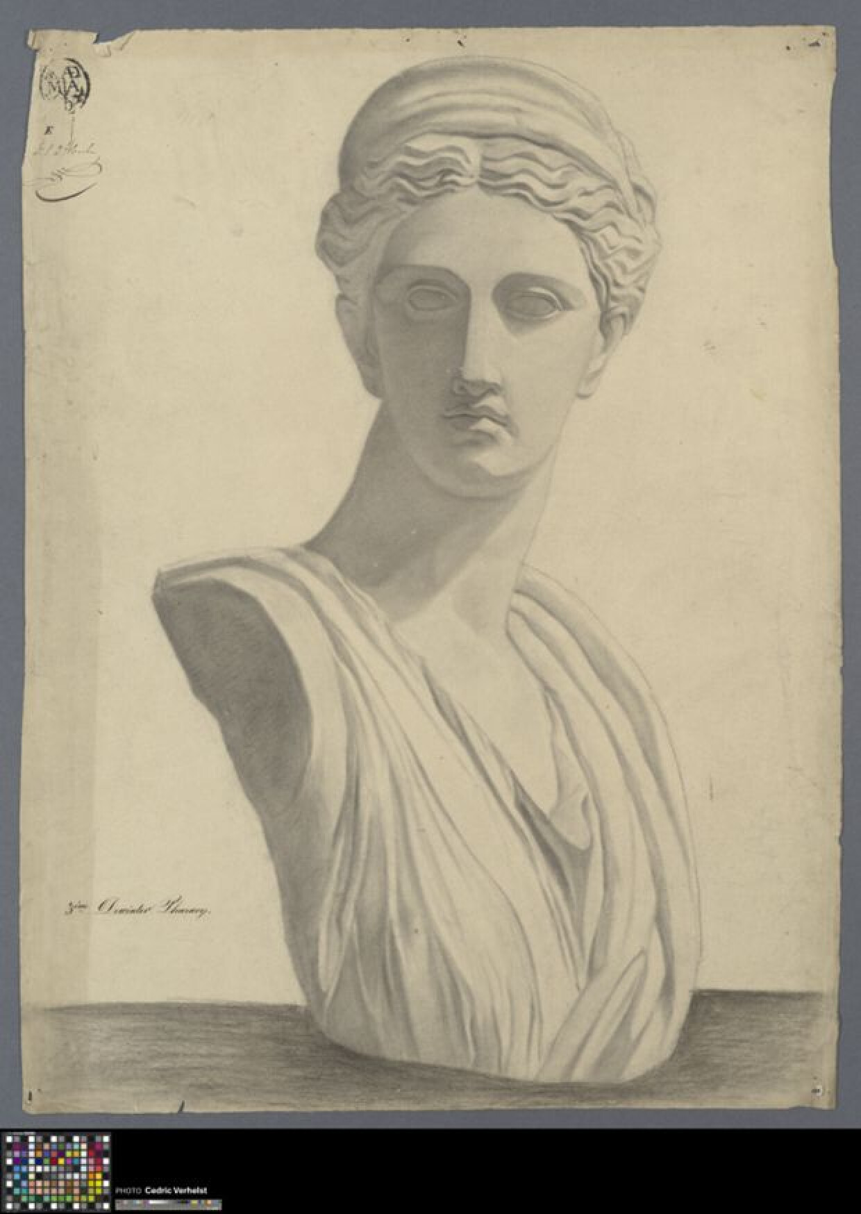 19de eeuwAcademische studie naar sculptuur van Diana, getekend door Pharaon de Winter. De Winter maakte deze studie wellicht tijdens de prijswedstrijd van 1865-1866 aan de Academie Brugge. Hij was toen ingeschreven in de klas naar sculptuur en won de derde prijs. De Winter tekende naar een afgietsel van het beeldhouwwerk Diana van Versailles (Louvre, Parijs), afgebeeld met diadeem in het golvend haar. De buste is vanuit driekwart aanzicht getekend, met het gezicht van Diana frontaal. Het gebruikte medium is zwart krijt of houtskool. Zijn klasgenoot Albéric Deroux won de eerste prijs (0022.GRO0601.II) en Edouard Goethals werd tweede (0022.GRO0600.II).