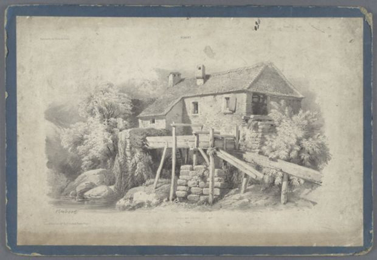 19de eeuwAcademische prent van een uitzicht op een molen, naar ontwerp van Hubert. Lithografie in zwarte inkt, verlijmd op een steunkarton bekleed met blauw papier. De prent werd uitgegeven bij Monrocq (Parijs) binnen de reeks "Portefeuille de l'Ecole de Dessin", wellicht ca. 1853-1855. Het gaat om plaat 77 uit deze reeks. Een molen is weergegeven aan een rivier. Zowel links als rechts is er wat vegetatie te zien. In de voorgrond liggen enkele rotsblokken aan het water. Deze lithografie is afkomstig van de Academie Brugge. De prent diende wellicht als didactisch materiaal.