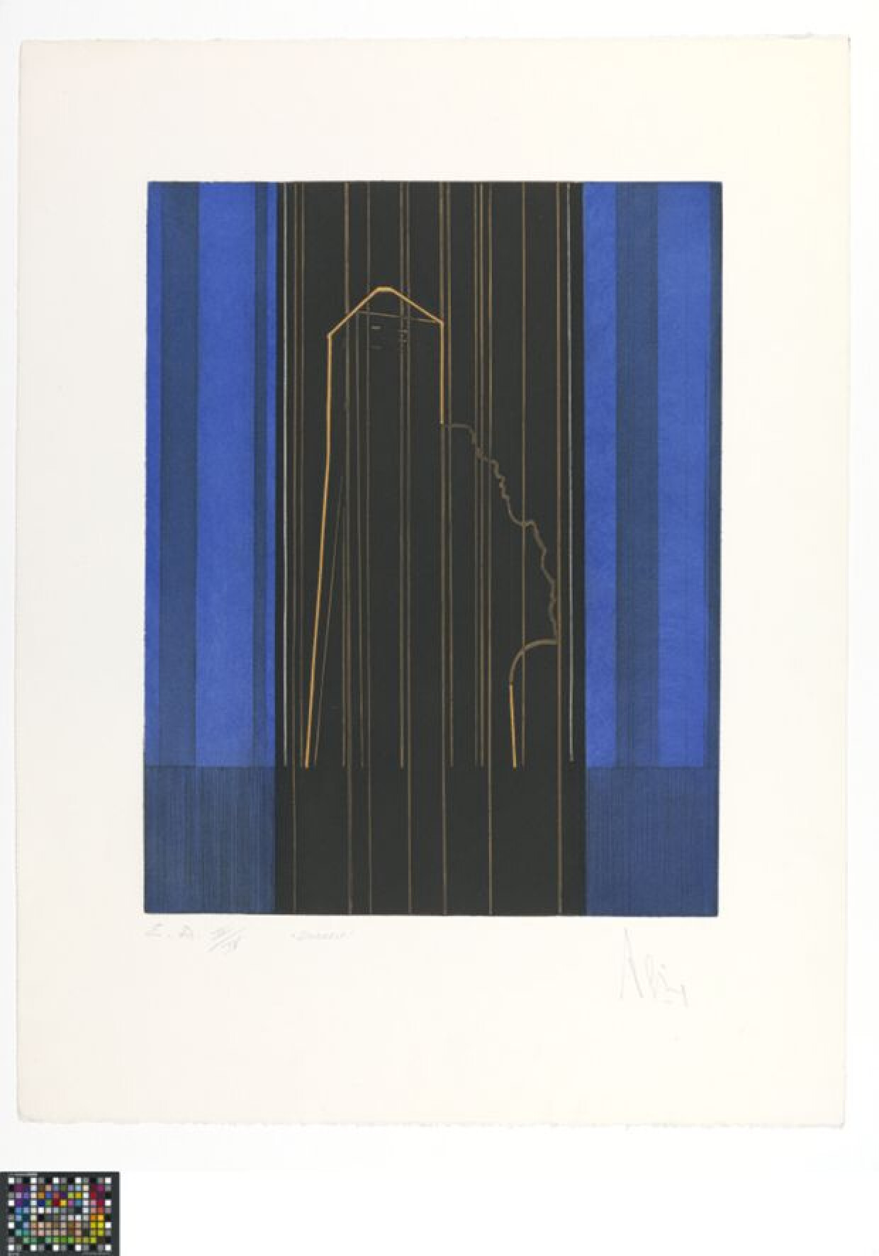 20ste eeuwKunstenaar Luc Peire (1916-1993) creëerde schilderijen, grafiek en architecturale integraties. Hij evolueert vanuit het expressionisme naar een stilering van de menselijke figuur om vervolgens in het midden van de jaren ‘50 zijn eigen stijl te ontwikkelen: het abstract verticalisme. Centraal in Peires abstract werk is de verticaliteit, de ruimte en de ritmiek. De verticale beweging staat voor hem symbool voor de mens als spiritueel wezen. Dit vertaalt zich in een compositie van verticale lijnen, balken en kleurvlakken die ruimte suggereren. Kenmerkend is ook het intens coloriet zoals rood, blauw, geel en oranje, dat gecontrasteerd wordt met zwart en wit. Naast schilder was Luc Peire ook graveur. Hij bezat een uitstekende kennis van de traditionele druktechnieken en realiseert etsen en aquatinten. Peire prepareert en graveert zelf zink- en koperplaten die hij op zijn eigen drukpers afdrukt of laat afdrukken in gespecialiseerde drukkerijen in Parijs. Het Prentenkabinet van Musea Brugge bezit het volledig grafisch oeuvre van Luc Peire, dat in 1992 geschonken werd door de kunstenaar zelf. Het gaat om 86 ingelijste werken. In 2017 schonk de Stichting Jenny & Luc Peire het laatste grafisch werk dat Luc Peire realiseerde in 1993 voor zijn overlijden in datzelfde jaar. Deze werken dateren van 1943-1993 en bieden een mooi overzicht van Luc Peires stijlevolutie. Sommige gravures worden gerealiseerd naar een van zijn schilderijen, zoals bijvoorbeeld ‘Ramses’ of ‘Yagul’. Het grafisch oeuvre van Luc Peire is onder te verdelen in drie periodes: - Figuratieve periode van 1935-1944. - Overgang naar abstractie rond 1955 met de etsen ‘Composition’ en ‘Composition-Espace’. - Ontwikkeling van zijn verticale abstracte stijl en uitbouw van zijn grafisch oeuvre vanaf 1964 tot 1993. Het graveren wordt een geliefde techniek van Peire vanaf 1964. Hij realiseert gravures in grijstinten, maar ook kleurdrukken waarbij hij één kleur op de voorgrond brengt. In deze periode heeft Luc Peire zijn eigen abstracte stijl verder ontwikkeld. Net zoals in zijn schilderijen bouwt hij zijn gravures op vanuit een ritmische compositie van verticale lijnen en kleurstroken op een monochroom vlak. Het werk 'Dudzele' is opvallend door de grillige contourlijn die doorheen de verticale compositie snijdt. Dit is het silhouet van de ruïne Sint-Leonarduskerk in Dudzele. Peire refereert hier uitzonderlijk naar een figuratief onderwerp.