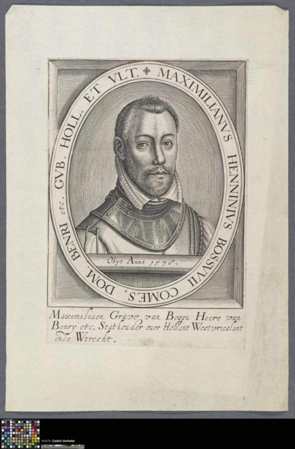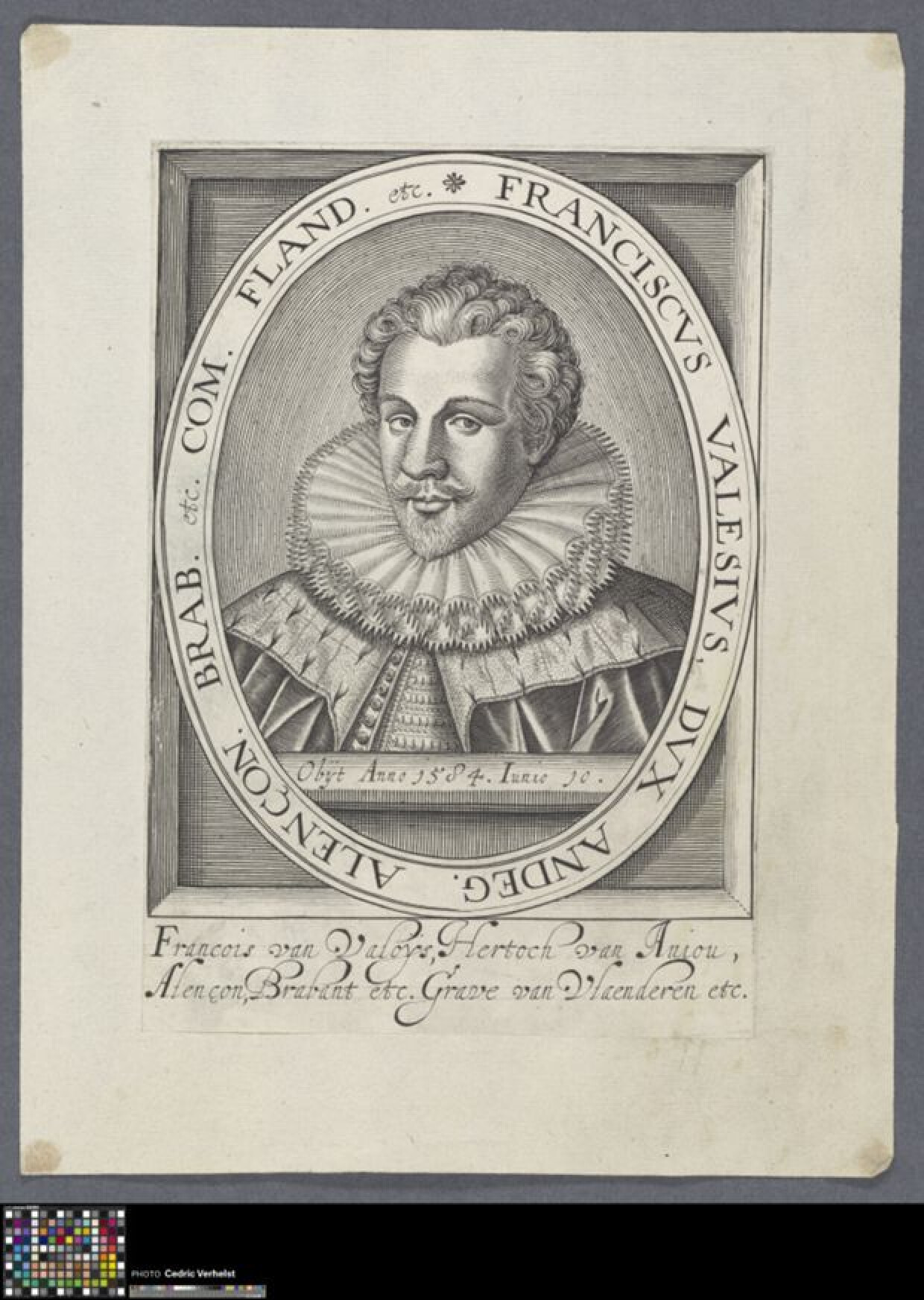 17de eeuwBusteportret van François, hertog van Anjou en Alençon (Parijs 1555 - Château-Thierry 1584). Hij was de jongste zoon van koning Hendrik II van Frankrijk en Catharina de' Medici. De hertog is in buste afgebeeld in een ovalen omlijsting met een inscriptie. Hij draagt een plooikraag en een mantel. Hij bevindt zich achter een borstwering met inscriptie. In de marge onderaan is een tweeregelig opschrift te lezen dat de geportretteerde identificeert. De prent maakt deel uit van een reeks portretten van Emanuel Van Meteren gepubliceerd in "Historie der Nederlandscher ende haerder na-buren oorlogen ende geschiede [...]" (Den Haag, 1614). Deze prent werd toegevoegd in de latere publicatie "Tooneel der beroemder Hertogen, Princen, Graven en de Krygs-helden" gepubliceerd door Nicolaes de Clerck (Delft, 1617). Maakt deel uit van het album met (losse) portretten uit de 16de en 17de eeuw (2014.GRO0019.III).