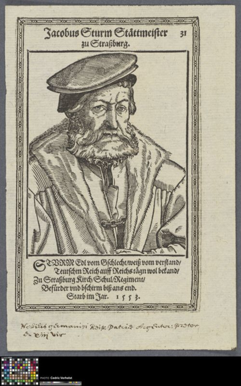 16de eeuwPetrus Apianus (Leisnig 1495 - 1552), geboren als Peter Bienewitz, was een Duitse humanist. Hij is hoofdzakelijk bekend door zijn werk in de wiskunde, astronomie en cartografie. Hij is halvelings naar links geportretteerd. Hij draagt een hoofddeksel en houdt in zijn rechterhand een passer vast. In zijn linkerhand houdt hij de globe vast. Zowel boven als onder de voorstelling is in de marge een opschrift te lezen dat meer informatie biedt over de geportretteerde. De prent maakt deel uit van een verzameling portretten, bestaande uit 103 houtsneden, gepubliceerd in "Contrafacturbuch. Ware und Lebendige Bildnussen […]" (Straatsburg, 1587). De prent maakt deel uit van het album met (losse) portretten uit de 16de en 17de eeuw (2014.GRO0019.III).