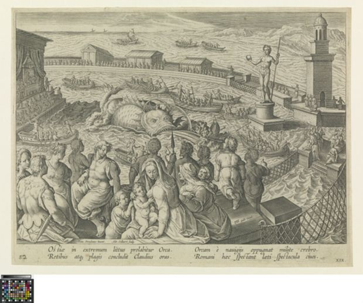 16de eeuwDeze prent stelt een walvisjacht voor die te Ostia wordt gehouden voor keizer Claudius. Ze behoort tot een reeks van 61 prenten (en titelprent), gegraveerd door Adriaan Collaert naar ontwerpen van Johannes Stradanus, uitgegeven door Philips Galle in 1596.