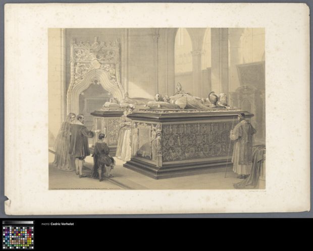 19de eeuwDeze prent toont de praalgraven van Maria van Bourgondië en haar vader Karel de Stoute in de Onze-Lieve-Vrouwekerk te Brugge. Maria van Bourgondië verongelukte in 1482 op heel jonge leeftijd na een tragische val van haar paard. Begin 16e eeuw werd in de tombe ook het hart van haar zoon Filips de Schone bijgezet. In de voorstelling bezoekt een familie de graven. De vader legt iets uit terwijl hij wijst naar het grafschrift. De lithografie is opgehoogd met wit.