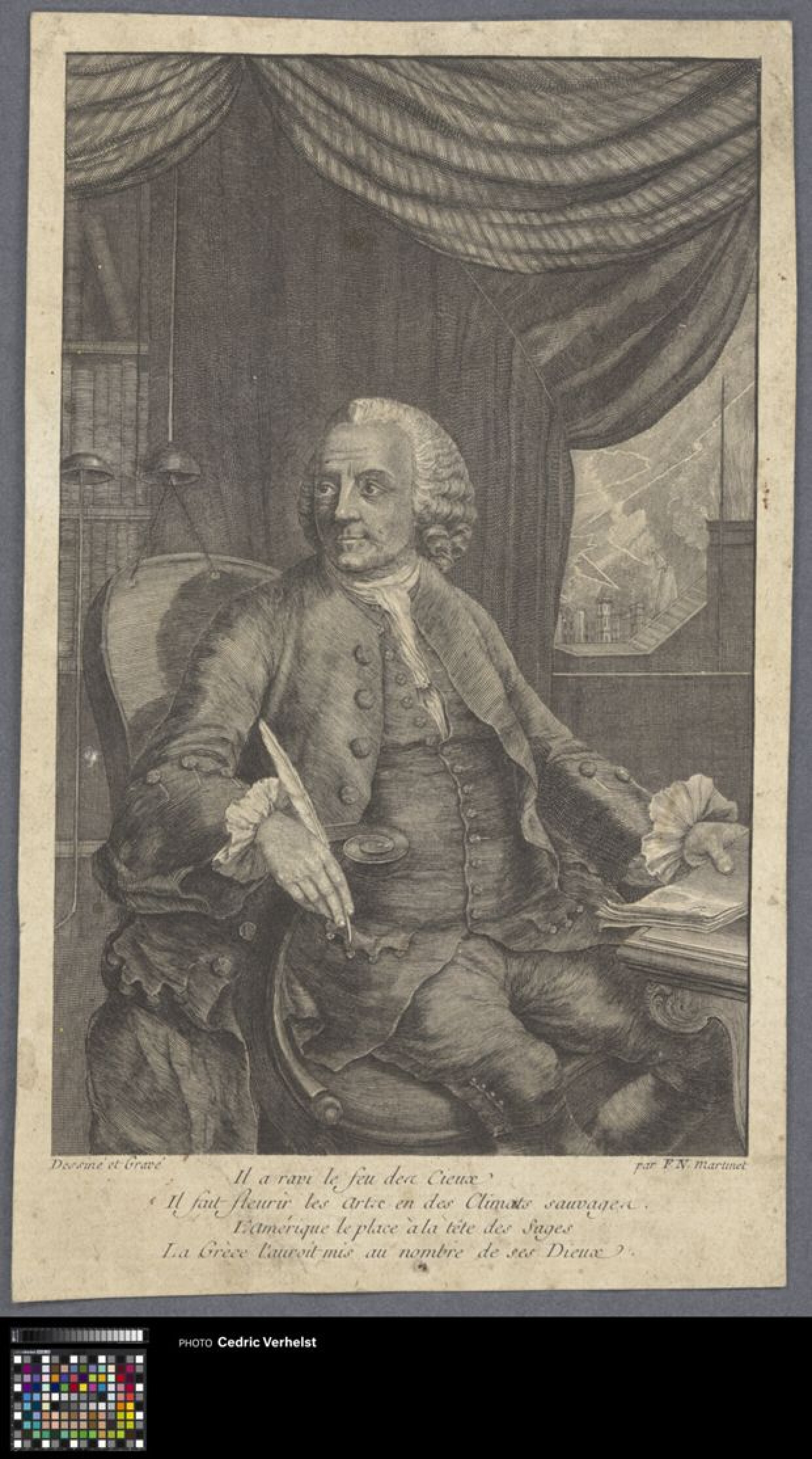 opschrift (in de voorstelling): Dessin\'e9 et Grav\'e9 (-) par F.N. Martinet/ Il a ravi le feu clerc Cieux/ Il fait fleurir les Artrc en des Climats sauvagen./ L'Amerique le place \'e0 la t\'eate des sages/ La Gr\'e8ce l'auroit mis au nobmre de ses Dieux.