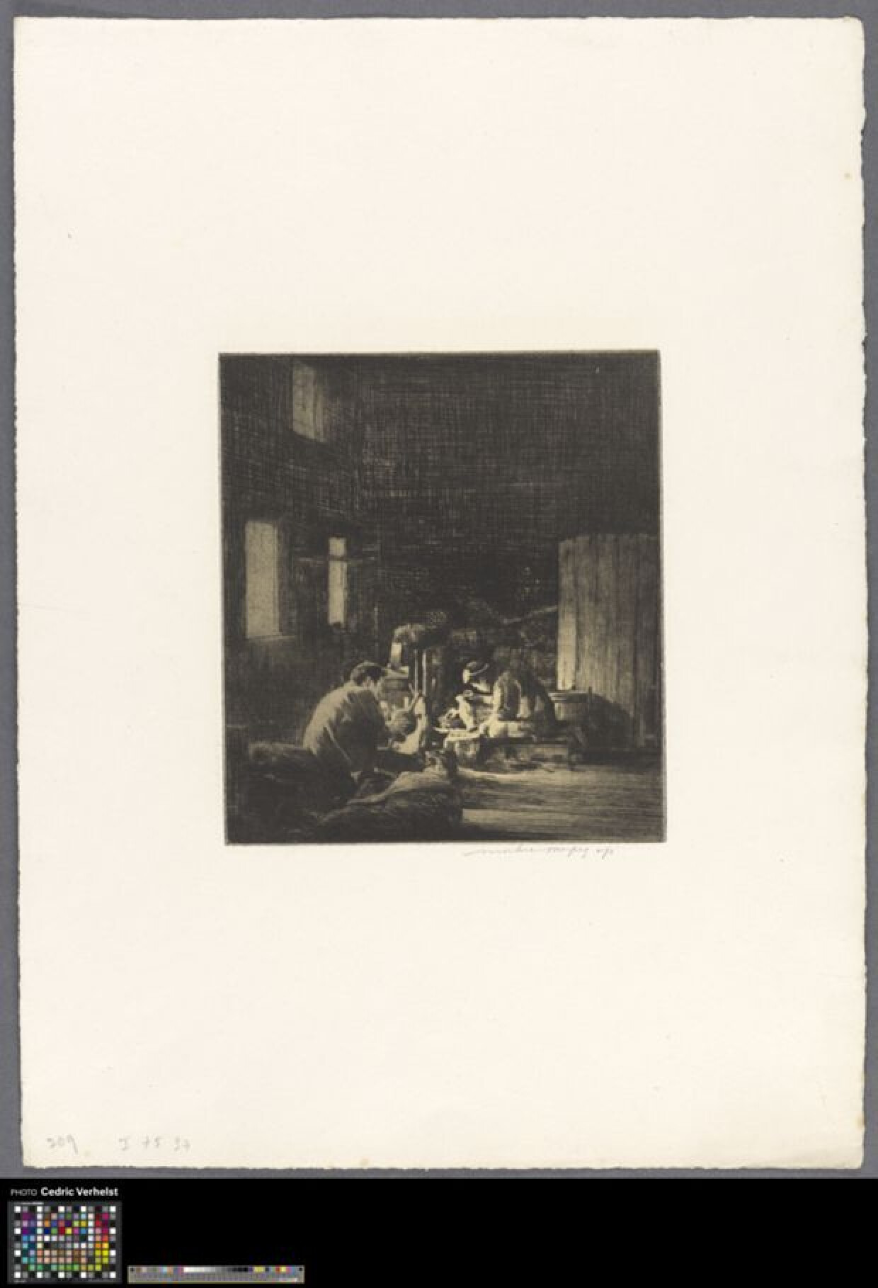 19de eeuw 20ste eeuwDe prent toont een donker interieur waarin twee mannen bezig zijn met het bewerken van brons. Door enkele ramen links in de voorstelling komt wat licht de ruimte binnen, waardoor de bronswerkers verlicht worden. De man links in de voorstelling is vanop de rug gezien. In zijn rechterhand houdt hij een vaas vast om deze te bekijken. De man rechts in de voorstelling is in profiel naar links afgebeeld. Hij zit met gebogen rug op de vloer en kijkt naar de vaas die hij met zijn rechterhand omhoog houdt.