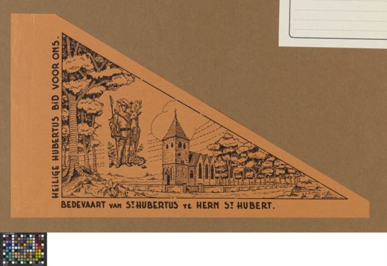 20ste eeuwBedevaartvaantje van papier, H. Hubertus te Sint-Huibrechts-Hern, type E. Vreven 34. Rechthoekige driehoek van links naar rechts. Getekend door E. Vreven in 1934. Lithografie. Zwarte afdruk op oranje papier. Links is nog net de rand van een bos zichtbaar. Daarnaast, zwevend, St. Hubertus als jager, met een speer in de rechterhand en zijn linkerarm rond de nek van een hert met een kruis tussen het gewei. Verder naar rechts de ommuurde kerk met vele bomen er achter. Links en onderaan het opschrift 'Heilige Hubertus bid voor ons. Bedevaart van St. Hubertus te Hern St. Hubert.'.