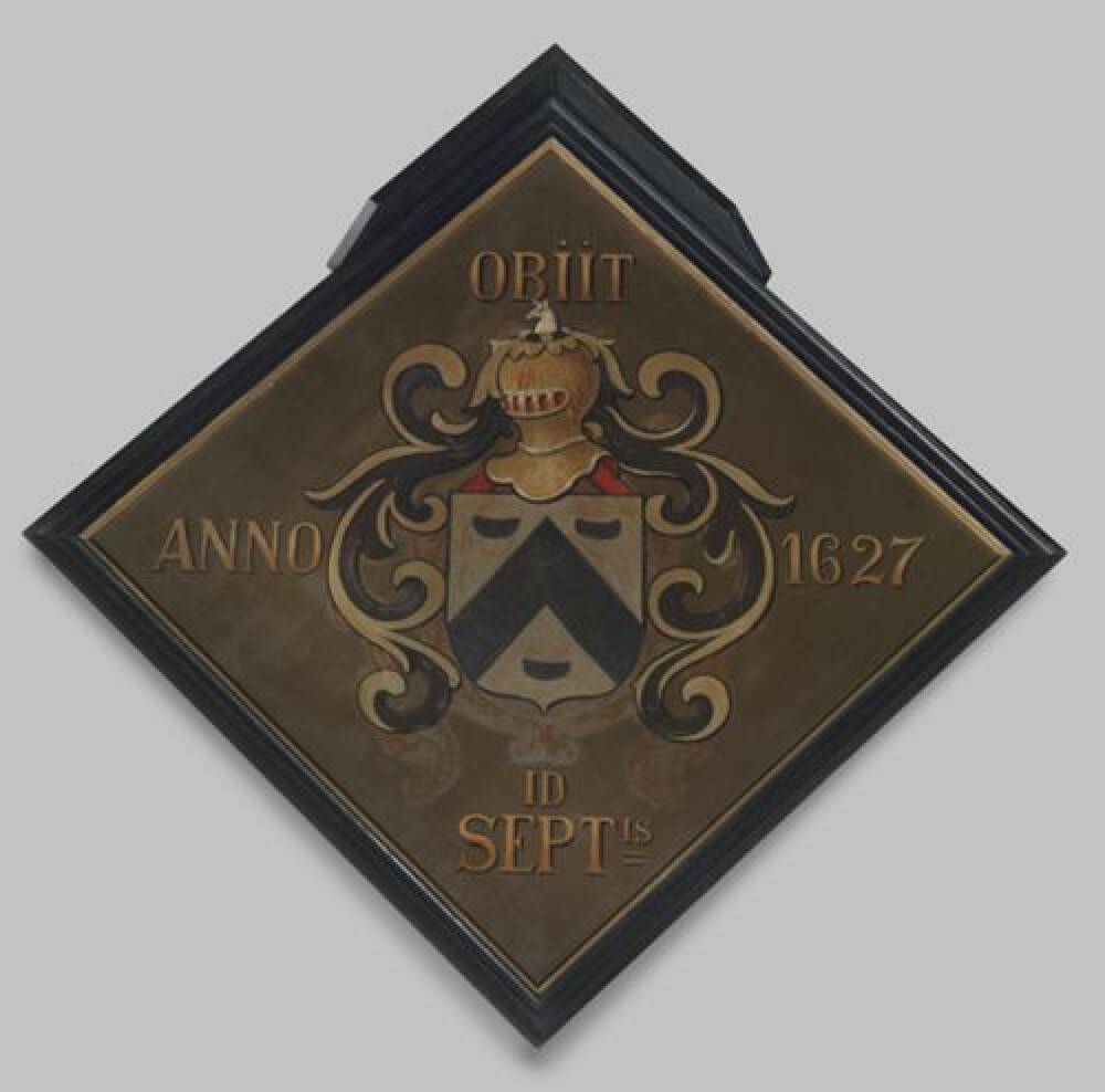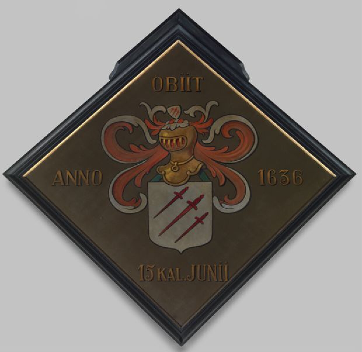 20ste eeuwRuitvormig wapenbord met wapen van Bernard Van der Straeten: zilver, 3 zwaarden van keel. Getopt met gouden helm getopt met hetzelfde schild. Met sterfdatum.