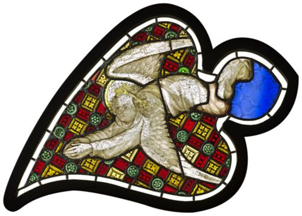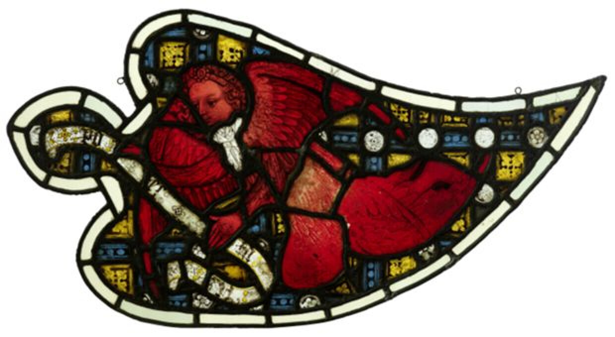 15de eeuwGlasraam met genimde vliegende engel tegen een achtergrond van gestileerde geometrische en florale motieven. De engel houdt een banderol met opschrift in de handen. Afkomstig uit het Brugse stadhuis.