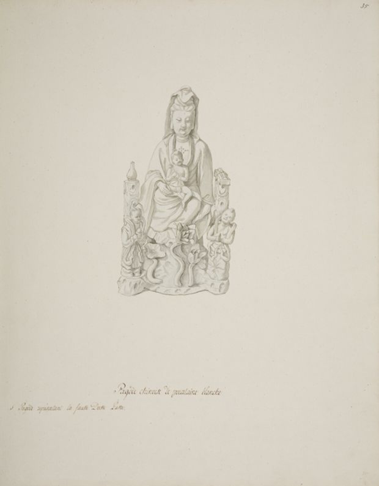 18de eeuwDeze tekening maakt deel uit van het Oosters Album (0000.GRO3119.II). We zien een afbeelding van de godin "Kuan-Yin" in blanc de chine of Fukien-porselein uit Tê-hua met een blauwachtig wit tot ivoorkleurig glazuur. Op haar schoot zit een klein kind. De godin, die zoals altijd een sieraad op de borst draagt, zit op een verhoog waarop lotusbloemen bloeien. Ze wordt aan weerszijden door twee kleinere figuurtjes geflankeerd. Onderaan noteerde de schilder of Van Huerne: "Pagode chinoise de porcelaine blanche. 1. Pagode représentant la fausse Deesse Pussa". De verzamelaar bezat slechts twee afgodsbeeldjes uit China. Een ervan bestond uit blanc de chine en kan als voorbeeld gediend hebben.
