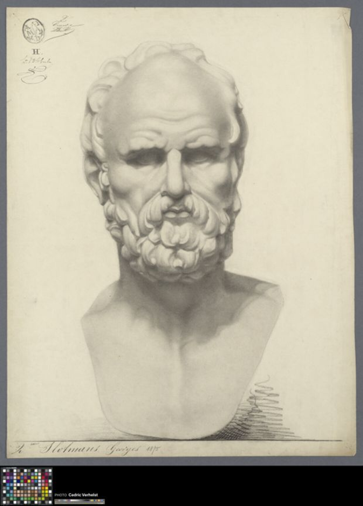 19de eeuwAcademische studie naar sculptuur een man, getekend door Joris (of Georges) Slotmans in 1875. Slotmans was toen leerling aan de Academie Brugge. Hij won met deze studie de tweede prijs op de prijskamp in de klas 'naar het antiek - kop'. Isidore Bertier werd toen eerste (0022.GRO0602.II). Een buste van een oudere man met baard is frontaal weergegeven in zwart of houtskool. Om welke buste het exact gaat, is nog onbekend. De aantekeningen duiden op Slotmans' wedstrijddeelname. Linksboven staat de academiestempel, met een handtekening van secretaris Vanden Abeelde. Daarbij is ook Slotmans' toegewezen letter 'H.' te zien. Dat hij tweede werd, noteerde men daarnaast en onderaan, inclusief zijn naam en het jaartal.